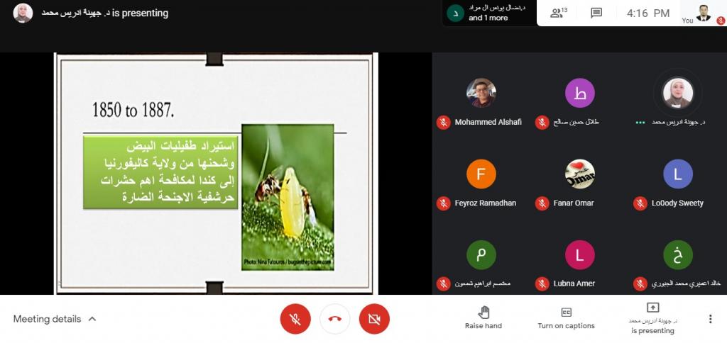Under the auspices of the Dean of the College of Agriculture and Forestry, Dr. Muhammad Yunus Al-Allaf, and the supervision of Dr. Juhayna Idris Muhammad (Head of the Plant Protection Department). The Plant Protection Department held a training course entitled (Standards and foundations for the application of biological enemies, their advantages and disadvantages), On Sunday 14-3-2021.The curriculum of the first day included one lecture that has entitled (Biological control: concept, stages, and its role in pest control management) by Dr. Juhayna Idris Muhammad.
