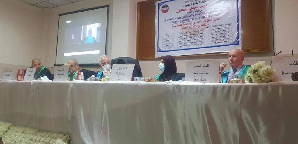 Deputies Dean of Scientific and Administrative Affairs attended a doctoral thesis discussion in the Department of Horticulture and Landscape Architecture / College of Agriculture and Forestry / University of Mosul for the student (Noor Duraid Saadi) on Thursday, 8/4/2021 in the Al-Hadba’a hall.The discussion committee consisted of: