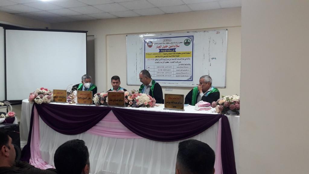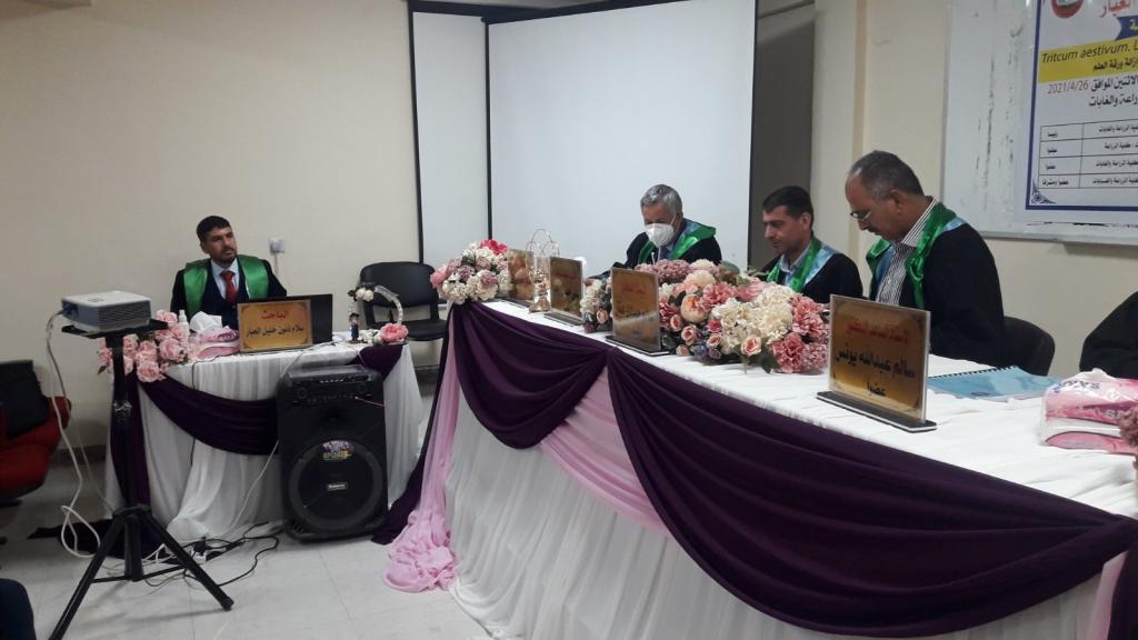 Prof. Dr. Muhammad Yunus Al-Allaf (Dean of the College) and Deputies Dean for Scientific and Administrative Affairs attended a master’s thesis discussion in the Department of Field Crops, for the student (Salam Thanun Khalil Ibrahim Al-Abbar) on Monday 26/4/2021 in the Al-Hadba’a hallThe discussion committee consisted of: