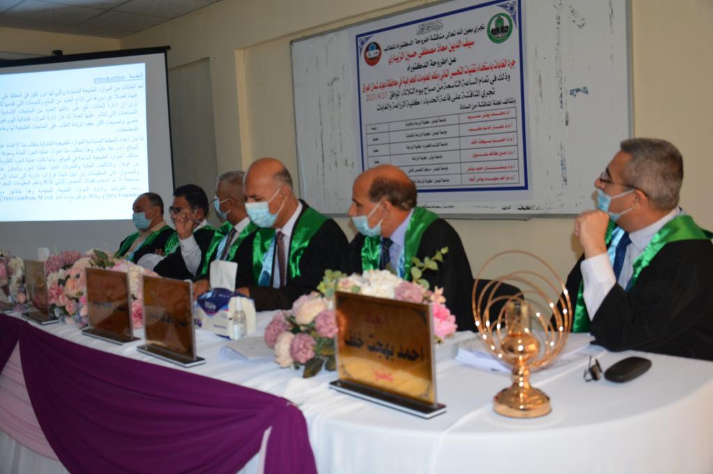 - Asst. Prof. Dr.Ahmed Bahjat Khalaf …. (Member).4.Asst. Prof. Dr. Hussein Kazem Aliwi …. (Member).5.Prof. Dr. Muzahim Saeed Al-Bak … (Member and supervisor).Then the discussion committee read the decision which included acceptance of the thesis and award the student a Ph.D. degree.*****Congratulations *****
