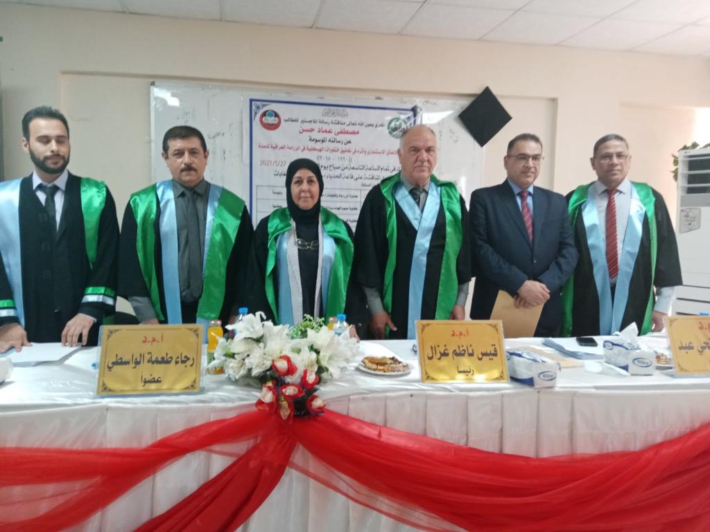 Prof. Dr. Muhammad Yunus Al-Allaf (Dean of the College) attended a master’s thesis discussion in the Department of Agricultural Economics, for the student (Mustafa Emad Hassan) on Thursday 27/5/2021 in the Al-Hadba’a hallThe discussion committee consisted of: