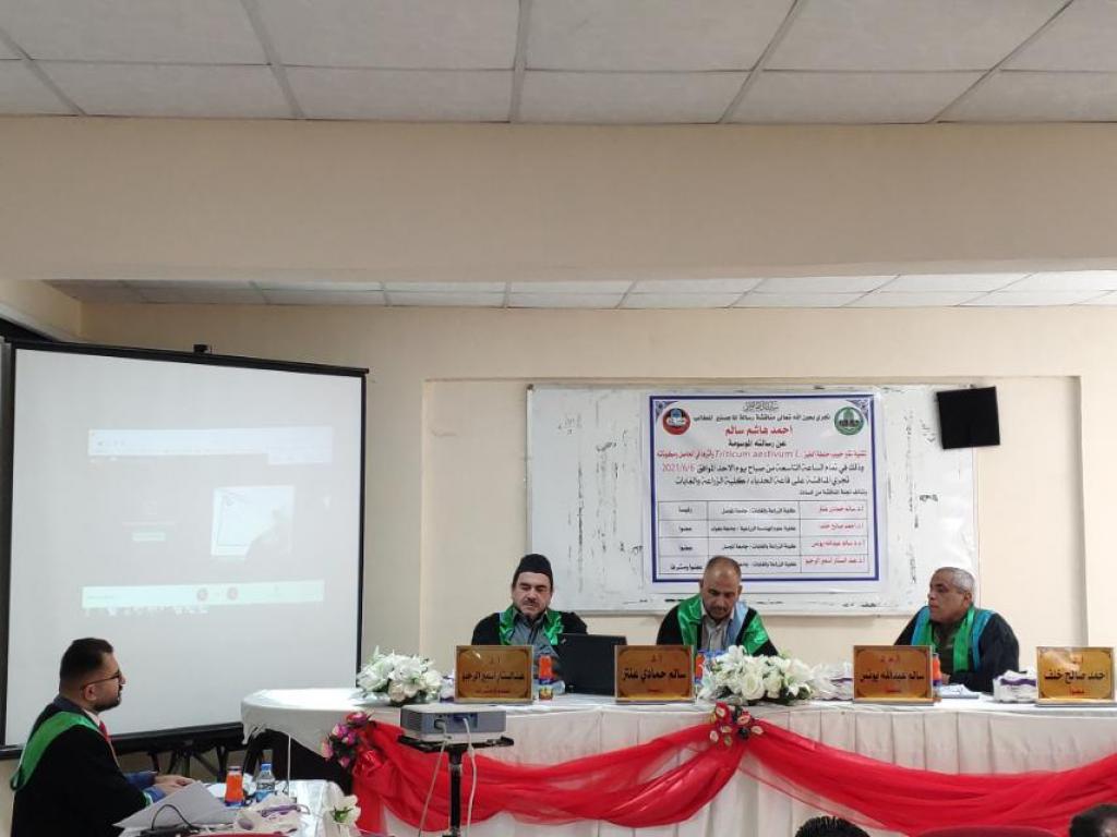 Prof. Dr. Muhammad Younis Al-Allaf (Dean of the College) and his scientific assistant attended a master’s thesis discussion in the Department of Field Crops, for the student (Ahmed Hashem Salem) on Sunday 6/6/2021in the Al-Hadba’a hall.The discussion committee consisted of: