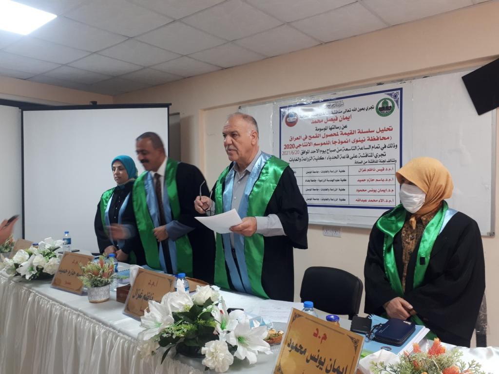 Prof. Dr. Muhammad Younis Al-Allaf (Dean of the College) attended a master’s thesis discussion in the Department of Agricultural Economics, for the student (Iman Faisal Muhammad) on Sunday 20/6/2021in the Al-Hadba’a hall.The discussion committee consisted of:Asst. Prof. Dr. Qais Nazim Ghazal … (Chairman).Asst. Prof. Dr. Bassem Hazem Hamid … (Member).Dr. Iman Younis Mahmoud … (Member).Asst. Prof. Dr. Alaa Muhammad Abdullah … (Member and supervisor).Then the discussion committee read the decision which included acceptance of the thesis and award the student an M.Sc. degree.*****Congratulations on Obtaining Your Master’s Degree*****
