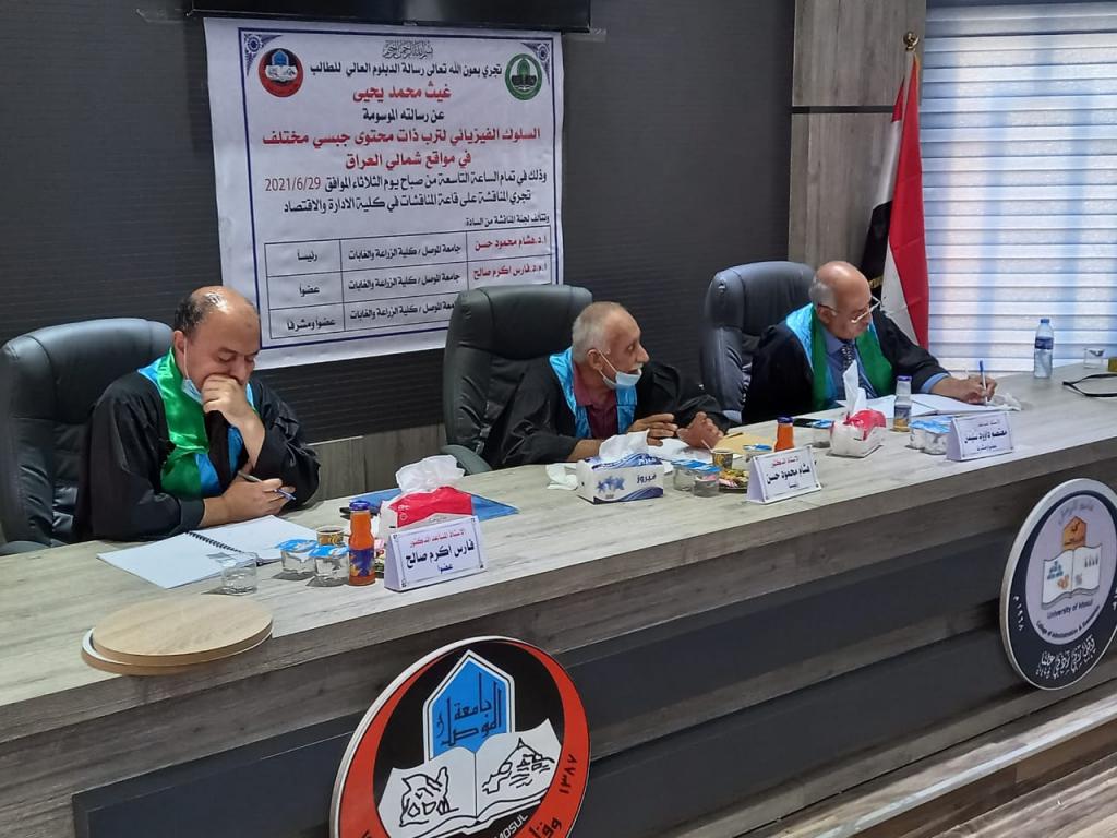 Within the scientific activities of the Soil Sciences and Water Resources Department, a higher diploma thesis in soil sciences and water resources was discussed for the student (Ghaith Muhammad Yahya), on Tuesday 29/6/2021 in the Al-Hadbaa Hall. The Dean of the College and his assistants for scientific and administrative affairs attended a part of the discussion.The discussion committee consisted of: