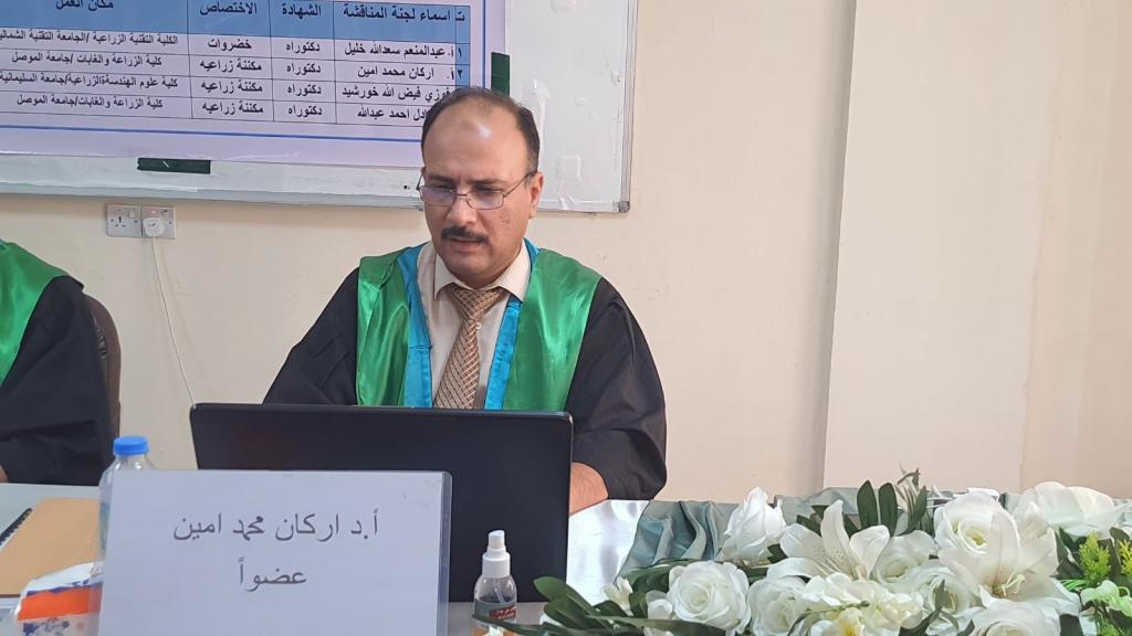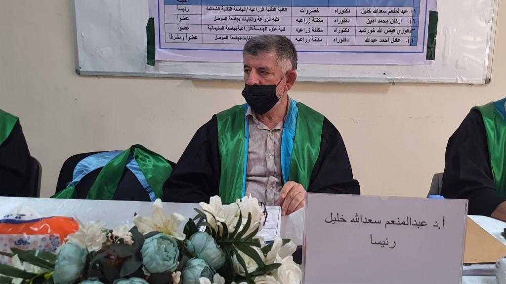 A master’s thesis was discussed in the Department of Agricultural Machines and equipment/ College of Agriculture and Forestry / University of Mosul, for the student (Muhammad Ali Khalaf) on Tuesday 3/8/2021. Prof. Dr. Muhammad Yunus Al-Allaf (Dean of the College) and assistant dean for administrative affairs attended a part of the discussion.The discussion committee consisted of: