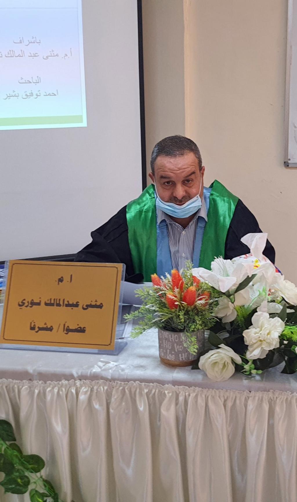 4. Asst. Prof. Muthanna Abdul-Malik … (Member and supervisor).Then the discussion committee read the decision which included acceptance of the thesis and award the student an M.Sc. degree.*****Congratulations on Obtaining Your Master’s Degree*****