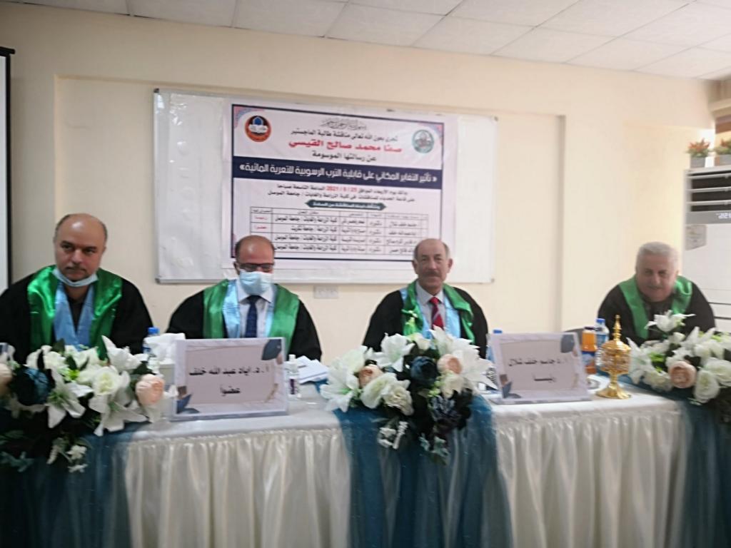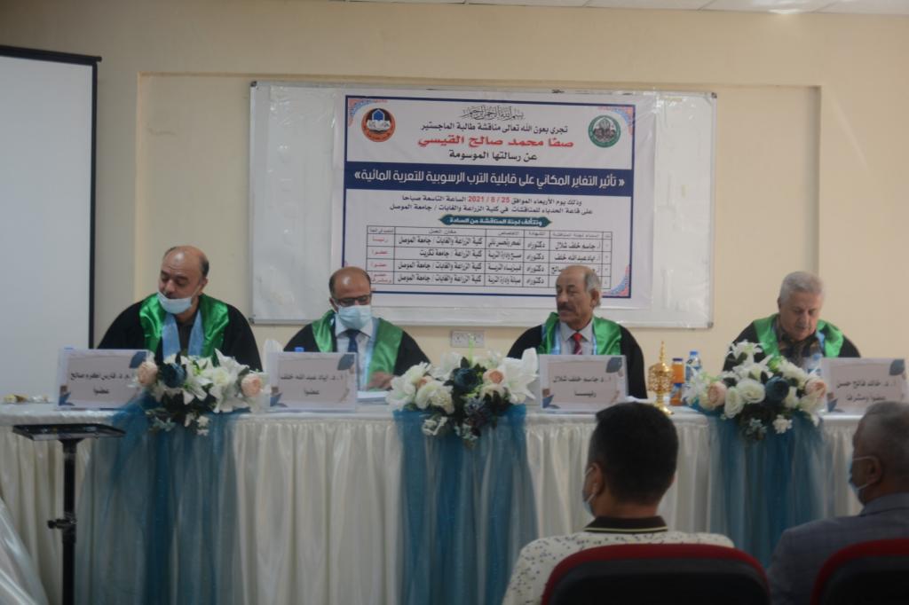 A master’s thesis was discussed in the Department of Soil Sciences and Water Resources/ College of Agriculture and Forestry / University of Mosul, for the student (Safa Muhammad Saleh Al-Qaisi) on Wednesday 25/8/2021. Prof. Dr. Muhammad Yunus Al-Allaf (Dean of the College) attended a part of the discussion.Summary of Thesis:This study aimed to determine the effect of spatial variability on the soil edibility factor (K-factor) for alluvial soils using three widely used empirical models {Nomo model (KNomo ), EPIC model (EPIC ), and modified EPIC model ( Kr ) }. The results indicated that there are significant differences between the calculated and predict values resulted from these models and the correlation between their values was very poor. To determine the accuracy of the extracted values of the Kr-model, the regression was analyzed between its values with the values of the variables extracted from it, which indicated that the best model representing this relationship is the Multiple Regression Analysis model. Finally, we can conclude that the computing method based on the KEPIC and KNomo models is not reasonable and suitable in our study area. Therefore, in consideration of the former research and basic information, the soil erodibility in this study area was calculated using modified EPIC ( Kr ) model methods for ensuring scientific and operative results in alluvial soil or soils has a considerable content of gravel separate.The discussion committee consisted of: