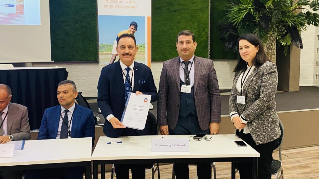 Prof. Dr. Qusay Kamal Al-Din Al-Ahmadi (President of the University of Mosul) participated in the work of the training course that is held for the trainees at the Dutch University of Wageningen. A delegation from the College of Agriculture and Forestry attended with the President of the University of Mosul. This delegation is headed by Prof. Ali Farouk Al-Maadidi (Assistant Dean for Scientific Affairs). Note that these courses include a variety of topics, including those related to agricultural research, which will serve the agricultural reality in the Nineveh Governorate, especially in areas that suffer from drought. It was agreed on axes of work with the sponsoring organization of the course, which will open future horizons for researchers and lecturers of our college.
