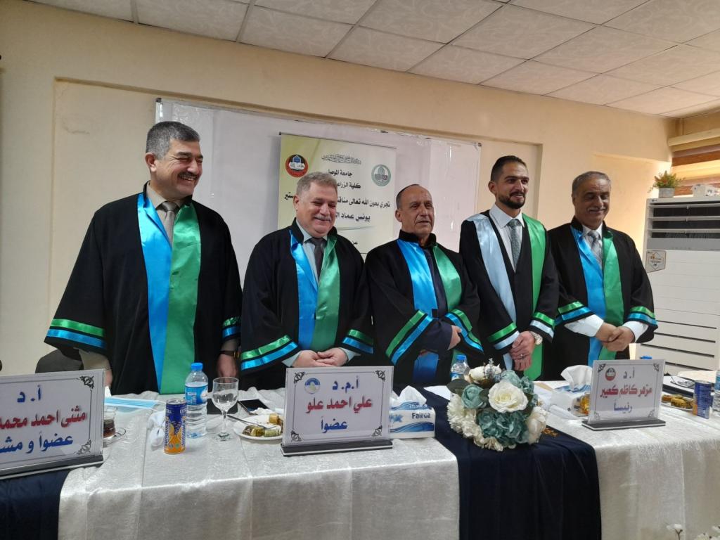 A master’s thesis was discussed in the Department of Animal Production/ College of Agriculture and Forestry / the University of Mosul on “Effect of feeding restriction and dried bread yeast on growth, carcase trates and the financial returns in Awassi lambs” for the student (Younis Imad Al-Din Muhammad) on Monday 22/11/2021. Prof. Dr. Muhammad Yunus Al-Allaf (Dean of the College) attended a part of the discussion.Thesis Summary:The study included twenty-four Awassi lambs with an average weight of 29.16 kg. The experiment was divided into four treatments. The first (control) was given free concentrated feed consisting of barley 61.75%, wheat bran 25%, soybean meal 5%, wheat straw 7%, urea 0.25 %, salt and lime 1%. The feeding of the other treatments was rationed to 80% of the consumption of lambs of the control treatment.More results are available in the thesis………The discussion committee consisted of: