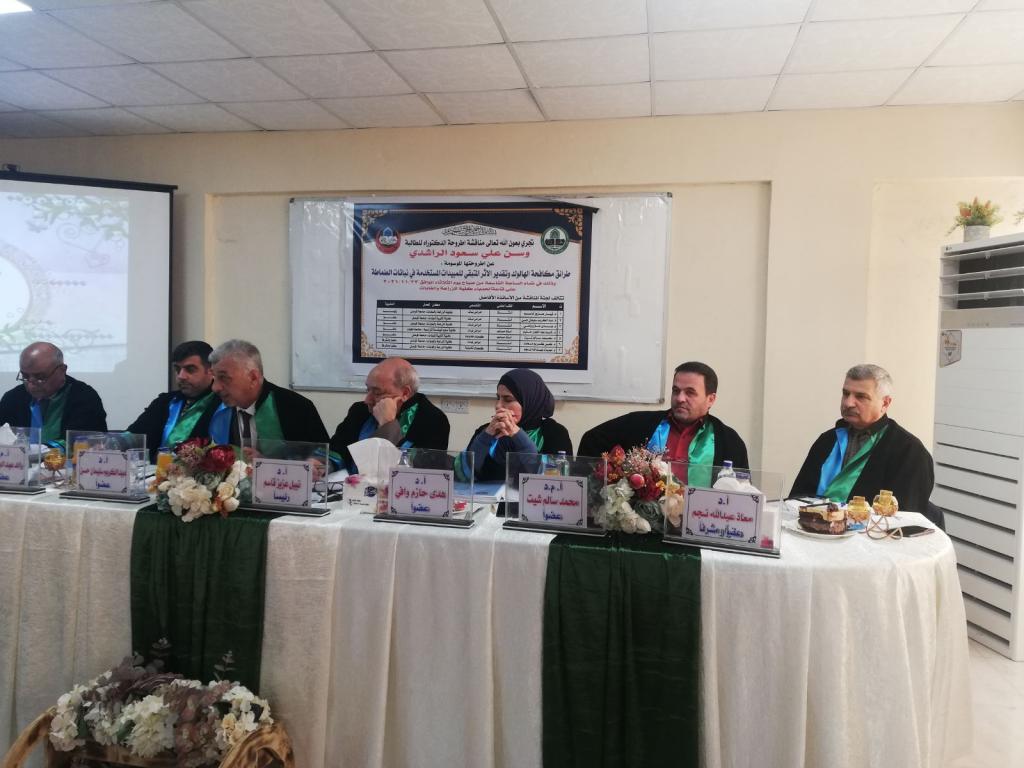A Ph.D. thesis was discussed in the Department of Plant Protection / College of Agriculture and Forestry / University of Mosul, for the student (Wasan Saud Ali Saud) on Tuesday 23/11/2021 in the discussion hall in Al-Hadba’a. Prof. Dr. Muhammad Younis Al-Allaf attended a part of the discussion.The discussion committee consisted of: