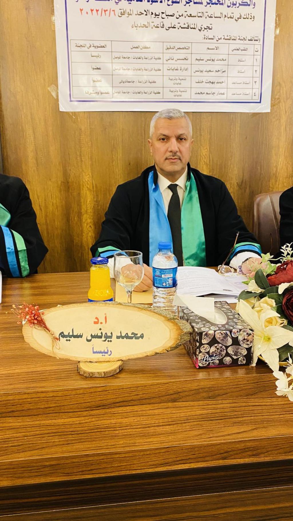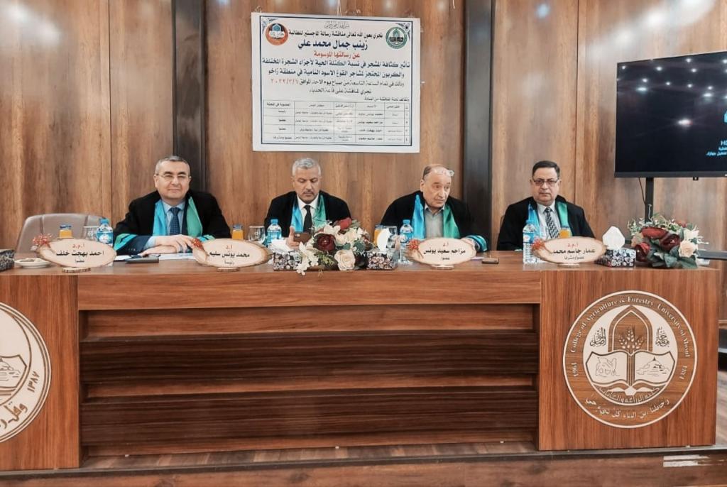 A master’s thesis was discussed in the Department of Forestry Sciences / College of Agriculture and Forestry / University of Mosul for the student (Zainab Jamal Muhammad) on Sunday, 6/3/2022. The study aims to estimate the dry weight of the various elements of the tree and arbor on the earth’s surface. In addition to studying the effect of planting density on the dry weight of the multiple aspects of the tree and estimating the carbon sequestered and the amount of carbon dioxide gas absorbed by the trees.The discussion committee consisted of: