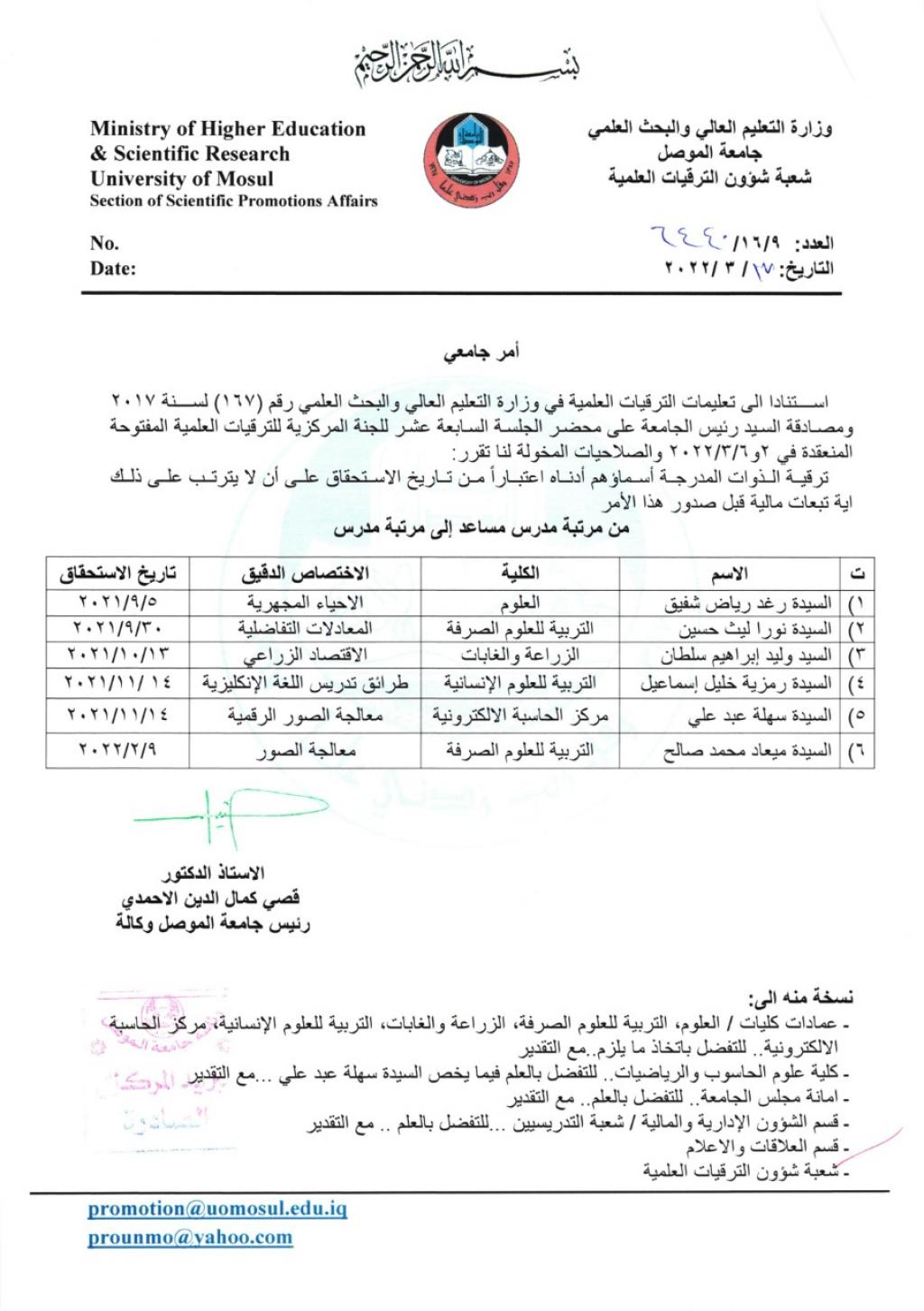 On behalf of all our faculty members, the Deanship of the College of Agriculture and Forestry, represented by Prof. Dr. Muhammad Yunus Al-Allaf (Dean of college) congratulations to Mr. Walid Ibrahim Sultan (lecturer in the Department of Agricultural Economics) on the occasion of his scientific promotion.*****Congratulations*******