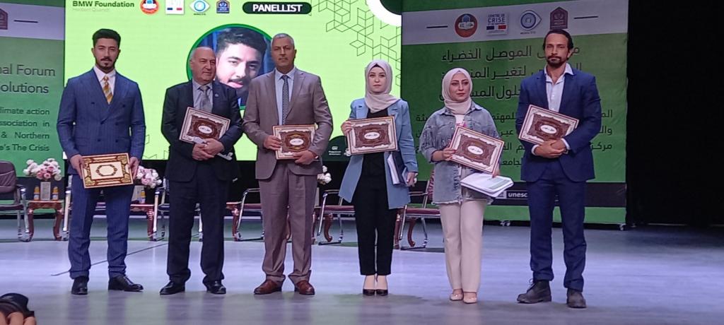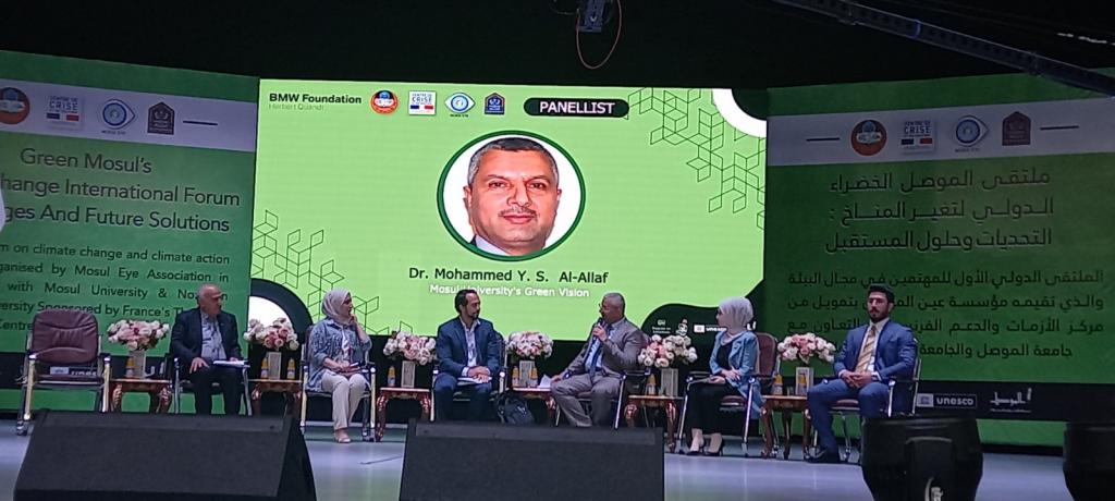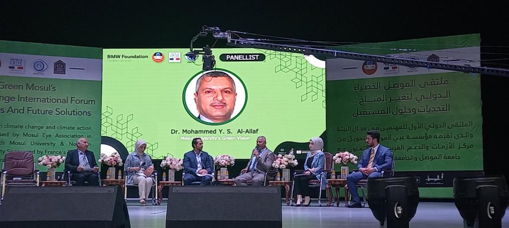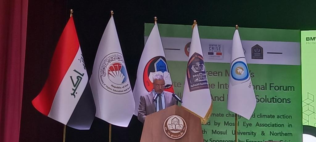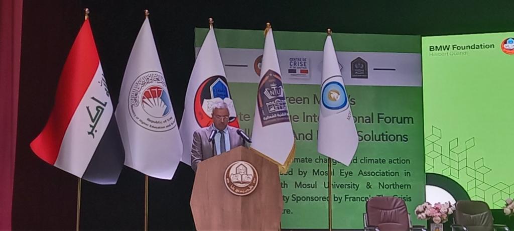 Today, Monday, May 9, 2022, Professor Dr. Qusay Kamal Al-Din Al-Ahmadi (President of Mosul University), several university presidents in Mosul, directors of government departments, and representatives of Nineveh Governorate attended the Mosul Green International Forum. Where Prof. Dr. Muhammad Younis Al-Allaf (Dean of the College) participated in the Green Mosul International Forum for Climate Change (Challenges and Future Solutions), which was held under the auspices of the Crisis and Support Center – the French Ministry of Europe and Foreign Affairs.In the beginning, the Dean of the College gave a speech on behalf of the President of Mosul University. Mr. Al-Allaf talked about the importance of vegetation cover in reducing the damages of climate change and the interest in increasing the area of green spaces and planting forest and horticultural trees.After the opening speech, the Dean participated in the dialogue session that followed the forum’s opening by giving a lecture on the importance of green spaces and planting forest and horticultural trees.