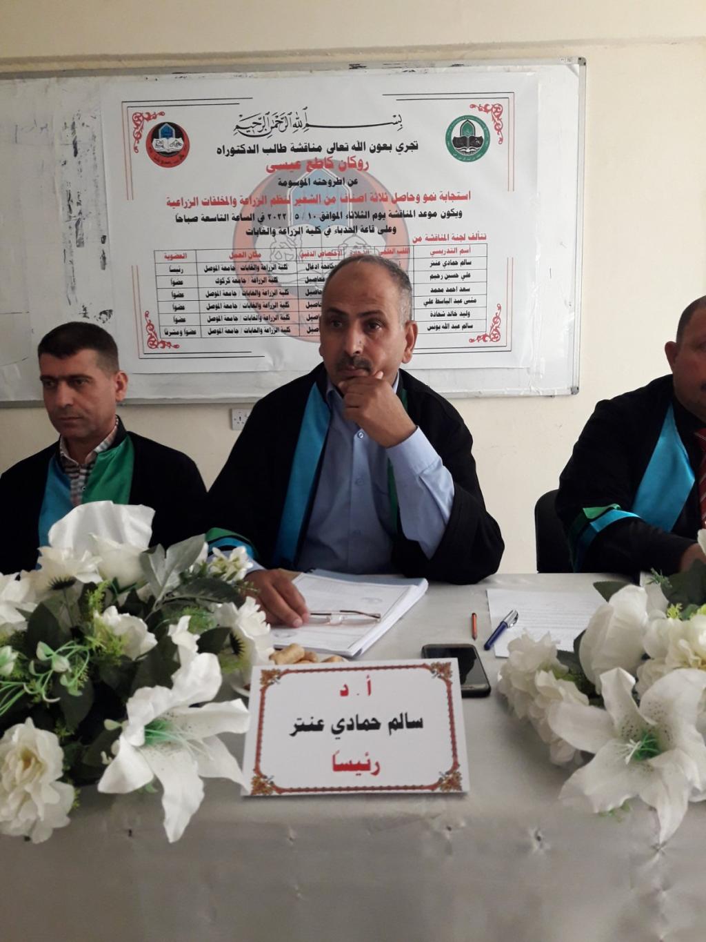 A Ph.D. thesis was discussed in the Department of Field Crops / College of Agriculture and Forestry / University of Mosul for the student (Rokan Katgh Issa) on Tuesday, 10/5/2022. Prof. Dr. Muhammad Yunus Al-Allaf (Dean of the College) attended a part of the discussion.Thesis title: Response of growth and yield of three barley cultivars to cultivation systems and agricultural residues.Thesis summary: A field experiment was conducted for the agricultural season (2020-2021) to study the response of the growth and yield of three cultivars of barley to farming systems and agricultural waste in two sites (Al-Hamdania and Al-Nimrud), which are located (15 km southeast and 65 km east) of Mosul, respectively. The experiment involved three factors: The first factor (three types of barley); the second factor (three cultivation methods); and the third factor (two levels of agricultural waste; the first level: is without agricultural residues, and the second level is 100% waste).More results are available in the thesis …..The discussion committee consisted of: