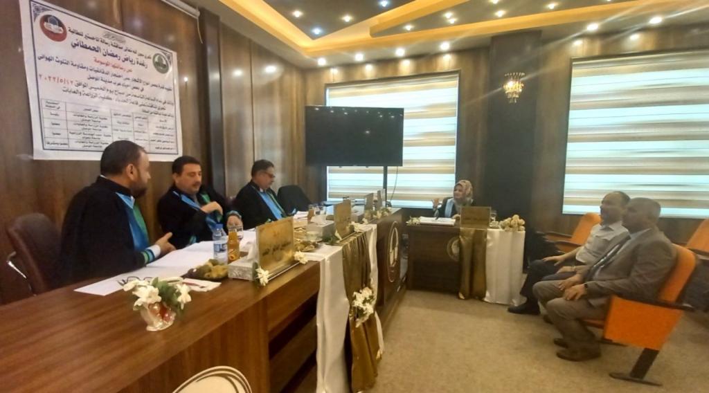 A master’s thesis was discussed in the Department of Forestry Sciences / College of Agriculture and Forestry / University of Mosul for the student (Raghda Riyadh Ramadan) on Thursday, 12-May -2022. Prof. Dr. Muhammad Yunus Al-Allaf (Dean of the College) attended a part of the discussion.Thesis title: Assessment of the ability of some types of trees to retain particulates and resist air pollution in some neighborhoods west of the city of Mosul.The discussion committee consisted of: