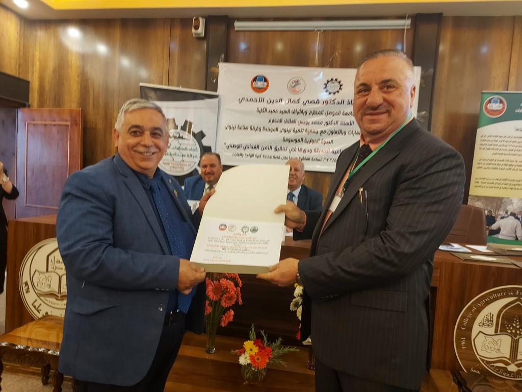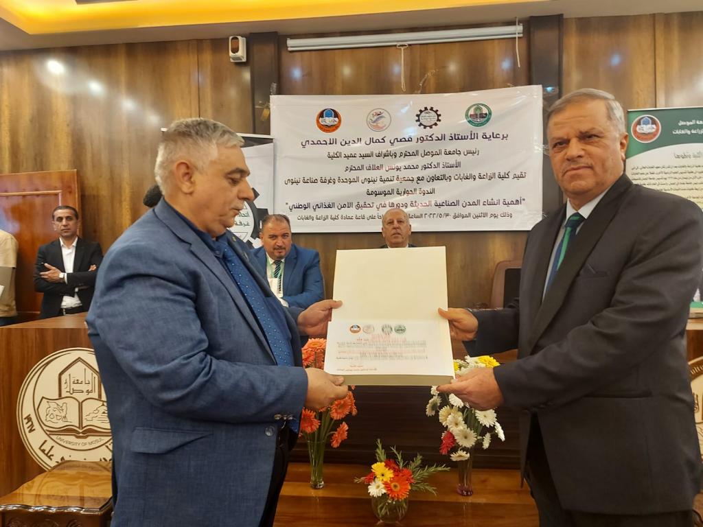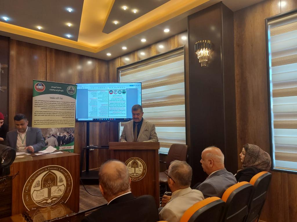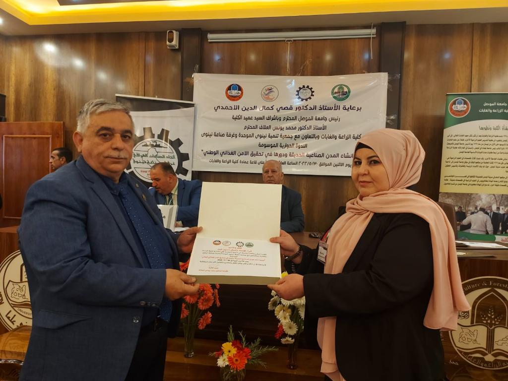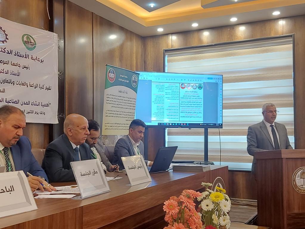 Under the patronage of Prof. Dr. Qusay Kamal Al-Din Al-Ahmadi (President of Mosul University) and the supervision and presence of Prof. Dr. Munir Salem Taha (Asst. President of the University for Scientific Affairs) and Prof. Dr. Muhammad Younis Al-Allaf (Dean of the College), the College of Agriculture and Forestry held the dialogue symposium on “the importance of establishing modern industrial cities and their role in achieving national food security.” The symposium cooperates with the Unified Nineveh Development Association and the Nineveh Chamber of Industry.The symposium’s curriculum began with a scented recitation of the Holy Qur’an. The speech of the preparatory committee was delivered by Prof. Dr. Muhammad Younis Al-Allaf and Prof. Dr. Ahmed Fakkak Al-Badrani (President of the Unified Nineveh Development Association) and Prof. Muhammad Ali Al-Mashhadani (Nineveh Chamber of Industry). The symposium included four lectures, followed by a dialogue session among the attendees, and concluded with a reading of the recommendations. The symposium was chaired by Prof. Dr. Muwaffaq Yahya Hamdoun and Dr. Uday Al-Obaidi.