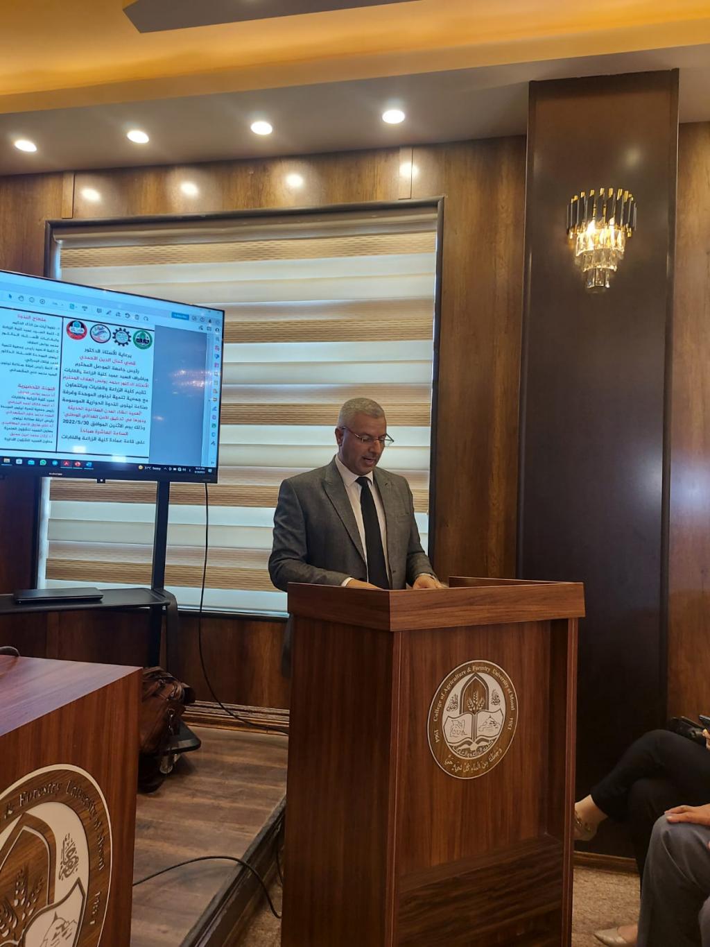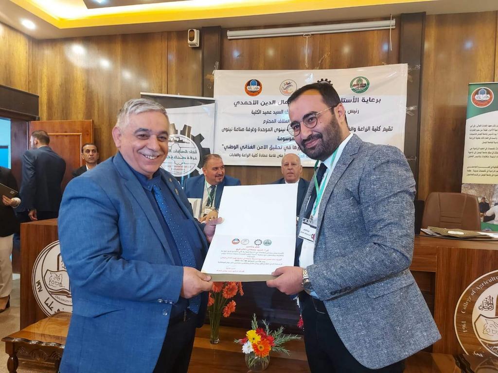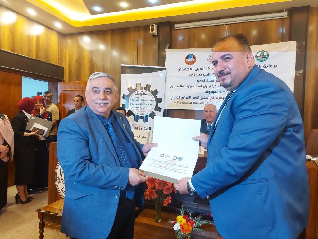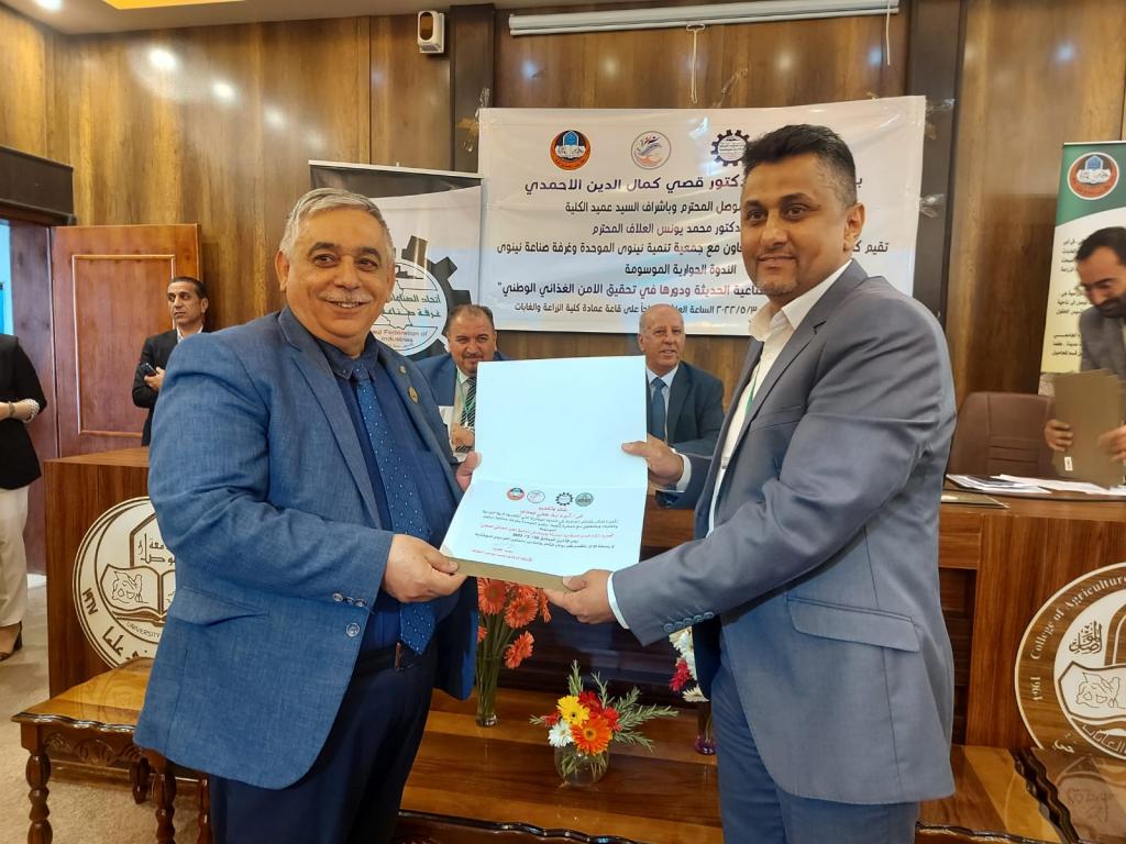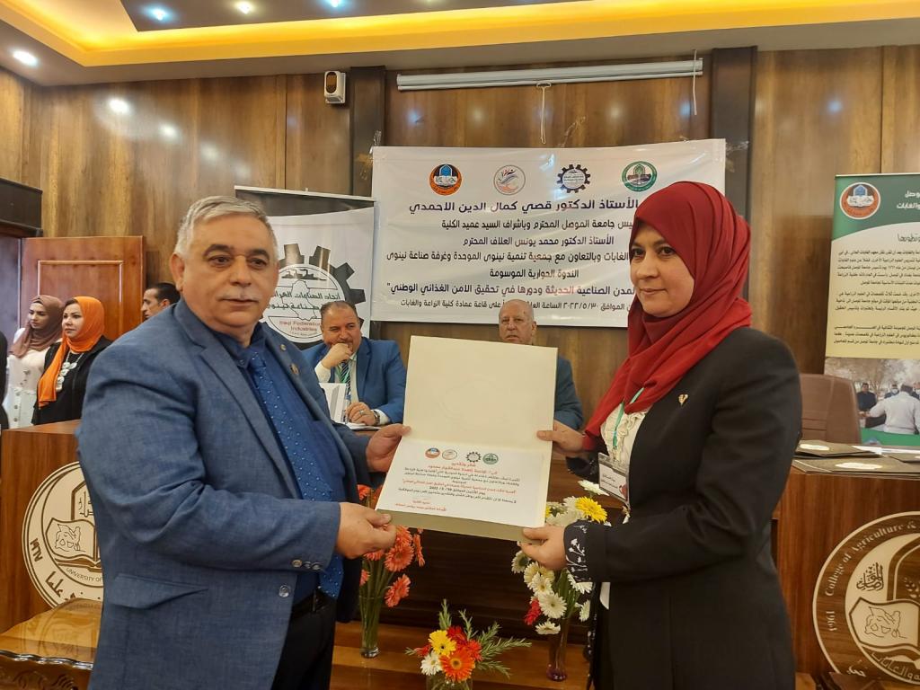 Under the patronage of Prof. Dr. Qusay Kamal Al-Din Al-Ahmadi (President of Mosul University) and the supervision and presence of Prof. Dr. Munir Salem Taha (Asst. President of the University for Scientific Affairs) and Prof. Dr. Muhammad Younis Al-Allaf (Dean of the College), the College of Agriculture and Forestry held the dialogue symposium on “the importance of establishing modern industrial cities and their role in achieving national food security.” The symposium cooperates with the Unified Nineveh Development Association and the Nineveh Chamber of Industry.The symposium’s curriculum began with a scented recitation of the Holy Qur’an. The speech of the preparatory committee was delivered by Prof. Dr. Muhammad Younis Al-Allaf and Prof. Dr. Ahmed Fakkak Al-Badrani (President of the Unified Nineveh Development Association) and Prof. Muhammad Ali Al-Mashhadani (Nineveh Chamber of Industry). The symposium included four lectures, followed by a dialogue session among the attendees, and concluded with a reading of the recommendations. The symposium was chaired by Prof. Dr. Muwaffaq Yahya Hamdoun and Dr. Uday Al-Obaidi.