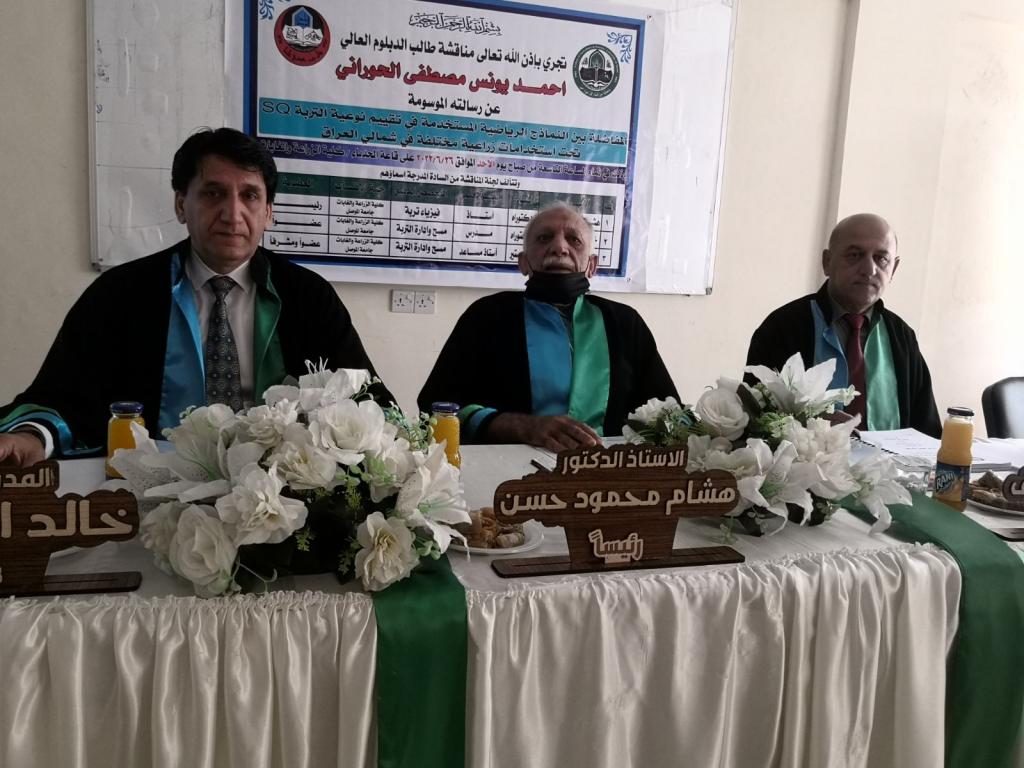Within the scientific activities of the Soil Sciences and Water Resources Department, a higher diploma thesis in the comparison between mathematical models used in assessing soil quality SQ under different agricultural uses in northern Iraq was discussed for the student (Ahmed Younis Mustafa Al-Hourani). Prof. Dr. Muhammad Younis Al-Allaf (Dean of the College) attended part of the discussion. The discussion was held on Sunday, June 26/ 2022, in the Al-Hadbaa Hall.The discussion committee consisted of: