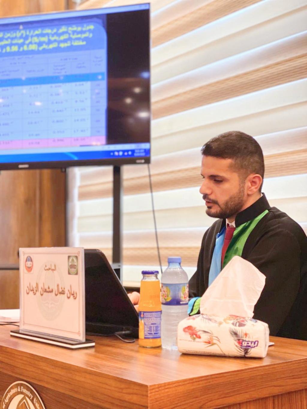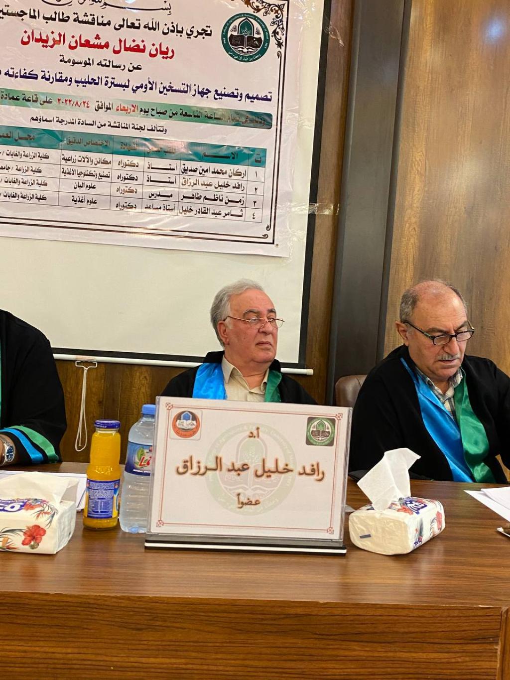 A master’s thesis was discussed in the Department of Food Sciences / College of Agriculture and Forestry / University of Mosul for the student (Rayan Nidal Mishaan Al-Zaidan) on Wednesday, 24-August -2022. Prof. Dr. Muhammad Younis Al-Allaf (Dean of the College) attended part of the discussionThe discussion committee consisted of: