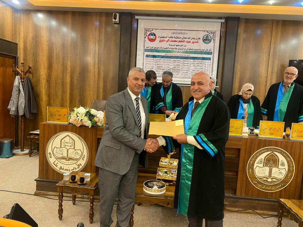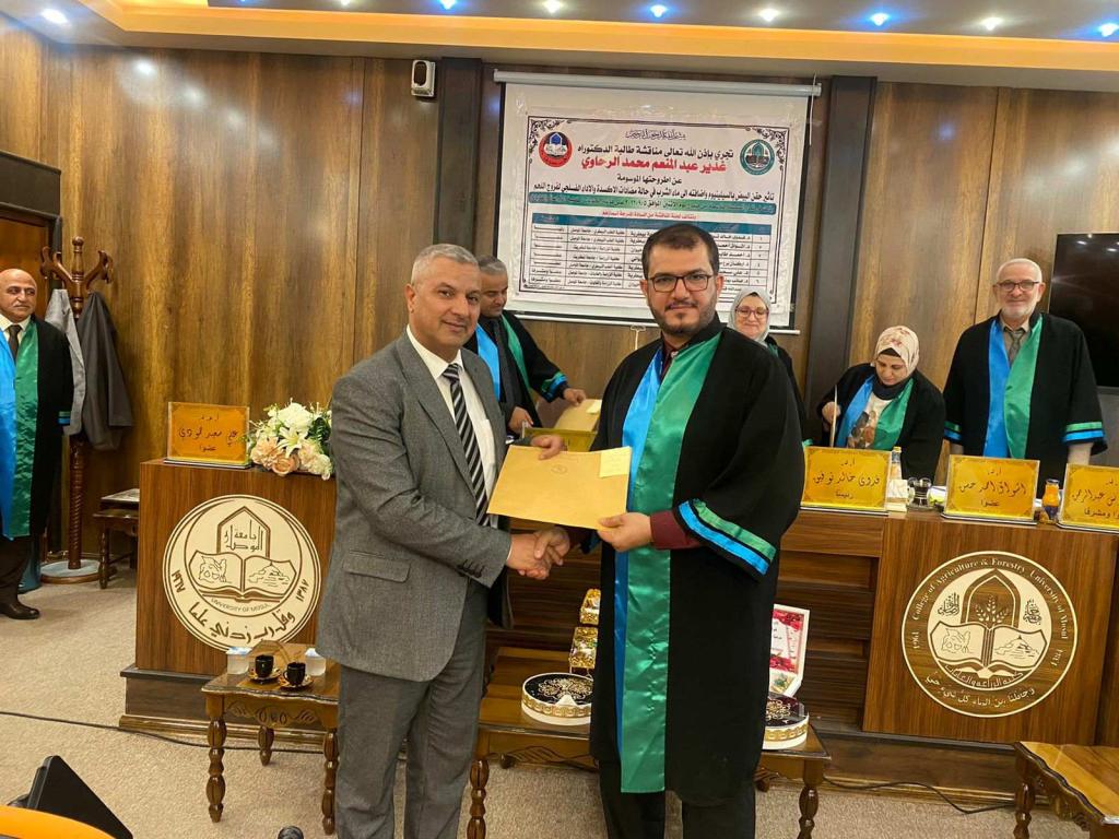 - Prof. Dr. Saeb Younis Abdel Rahman …. (Member and supervisor).7-Dr. Abdullah Fathi Abdel Majid …. (Member and supervisor).Then the discussion committee read the decision, which included accepting the thesis and awarding the student a Ph.D. degree.*****Congratulations *****