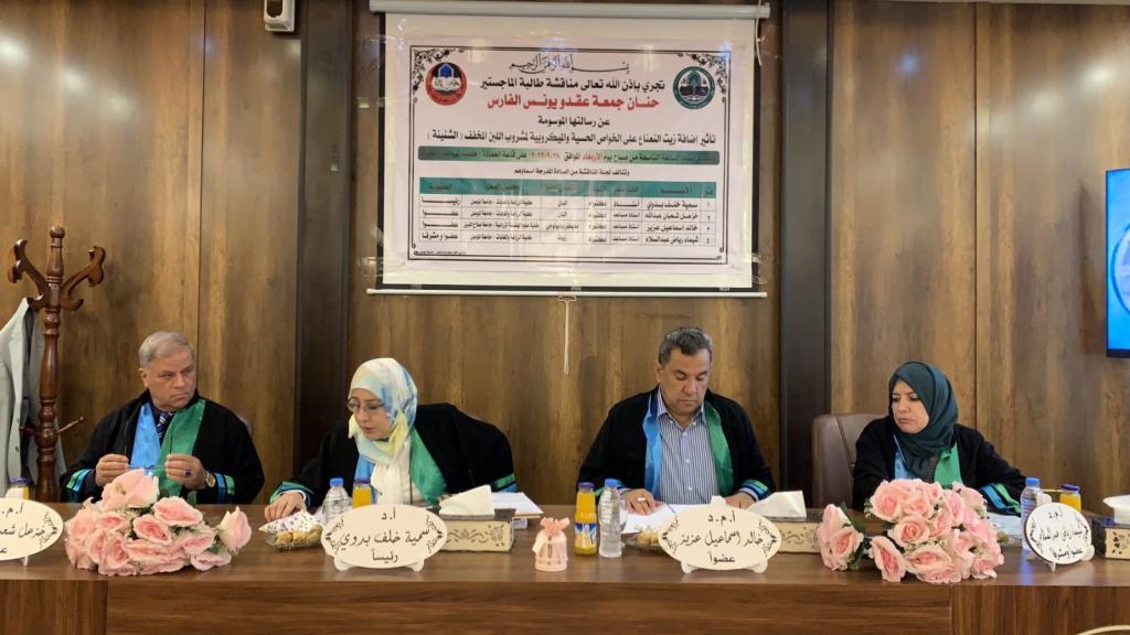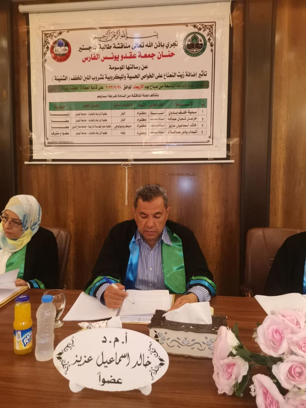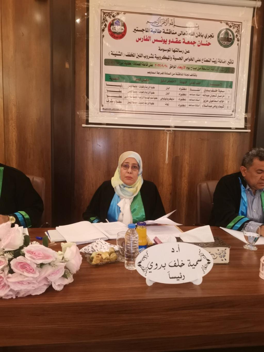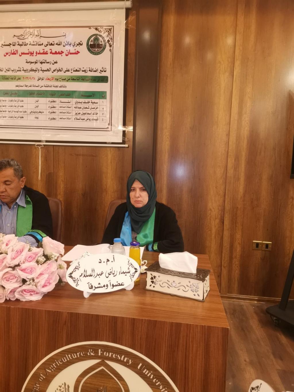 A master’s thesis was discussed in the Department of Food Sciences/ College of Agriculture and Forestry / University of Mosul for the student (Hanan Jumaa Akdo) on Wednesday, 28-September -2022. The title of the master’s thesis was “The Effect of Adding Peppermint Oil on the Sensory and Microbial Properties of Softened Milk Drink (Al-Shenina). ” Prof. Dr. Muhammad Younis Al-Aalaf (Dean of the College) attended a part of the discussionThe discussion committee consisted of: