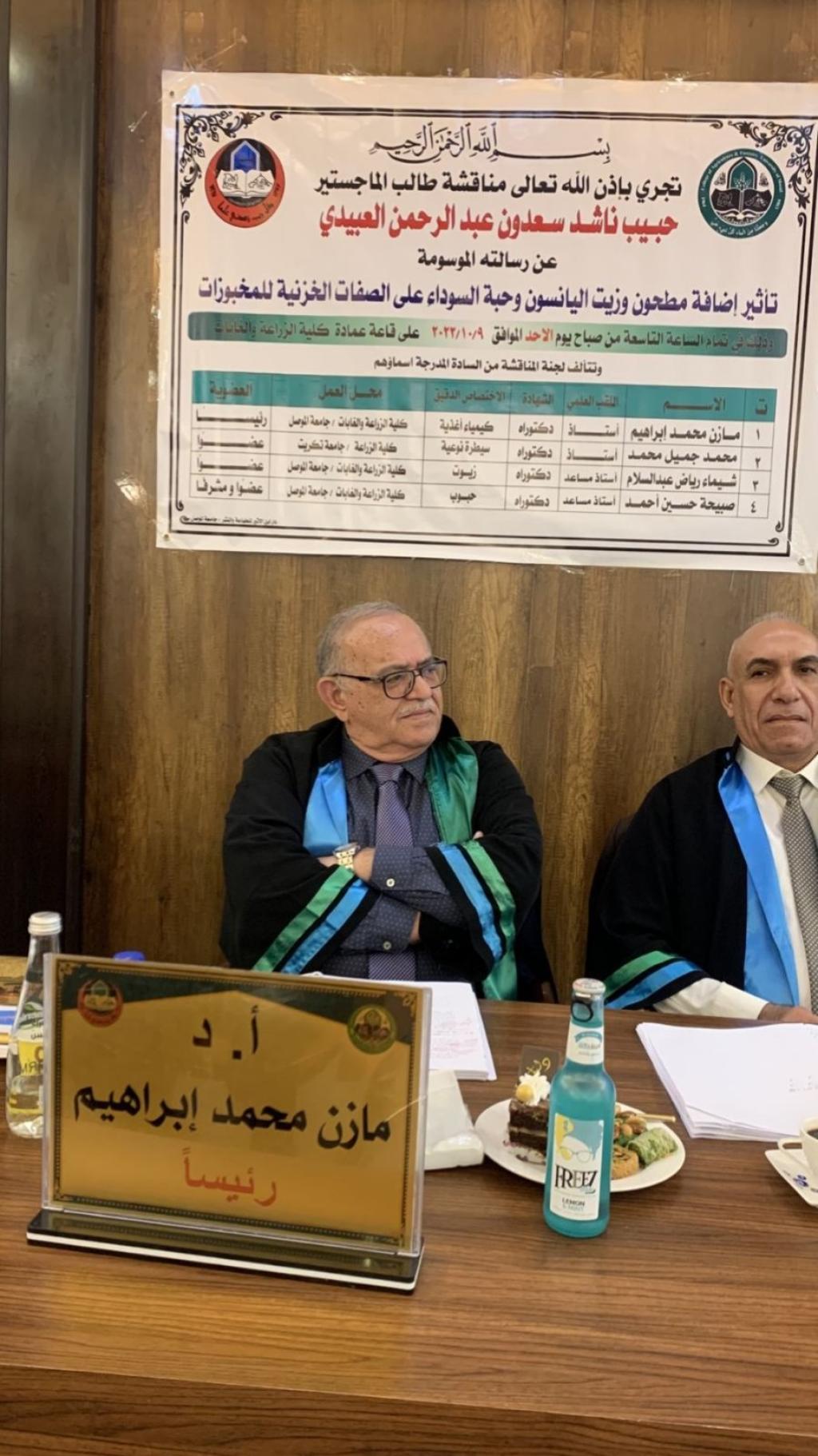A master’s thesis was discussed in the Department of Food Sciences/ College of Agriculture and Forestry / University of Mosul for the student (Habib Nashed Saadoun) on Sunday, 9-October -2022.The discussion committee consisted of: