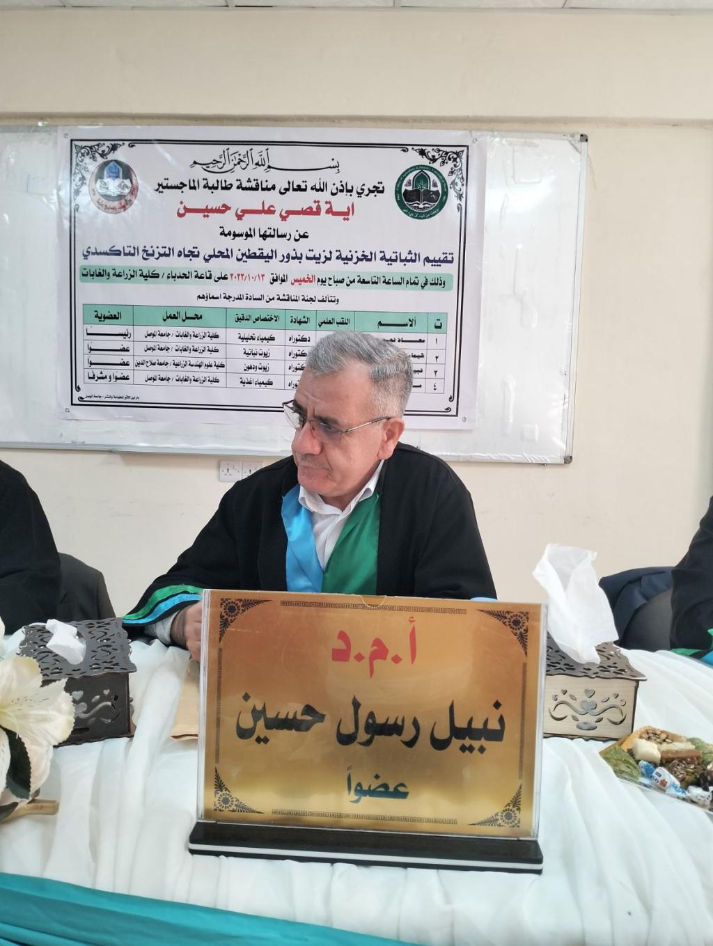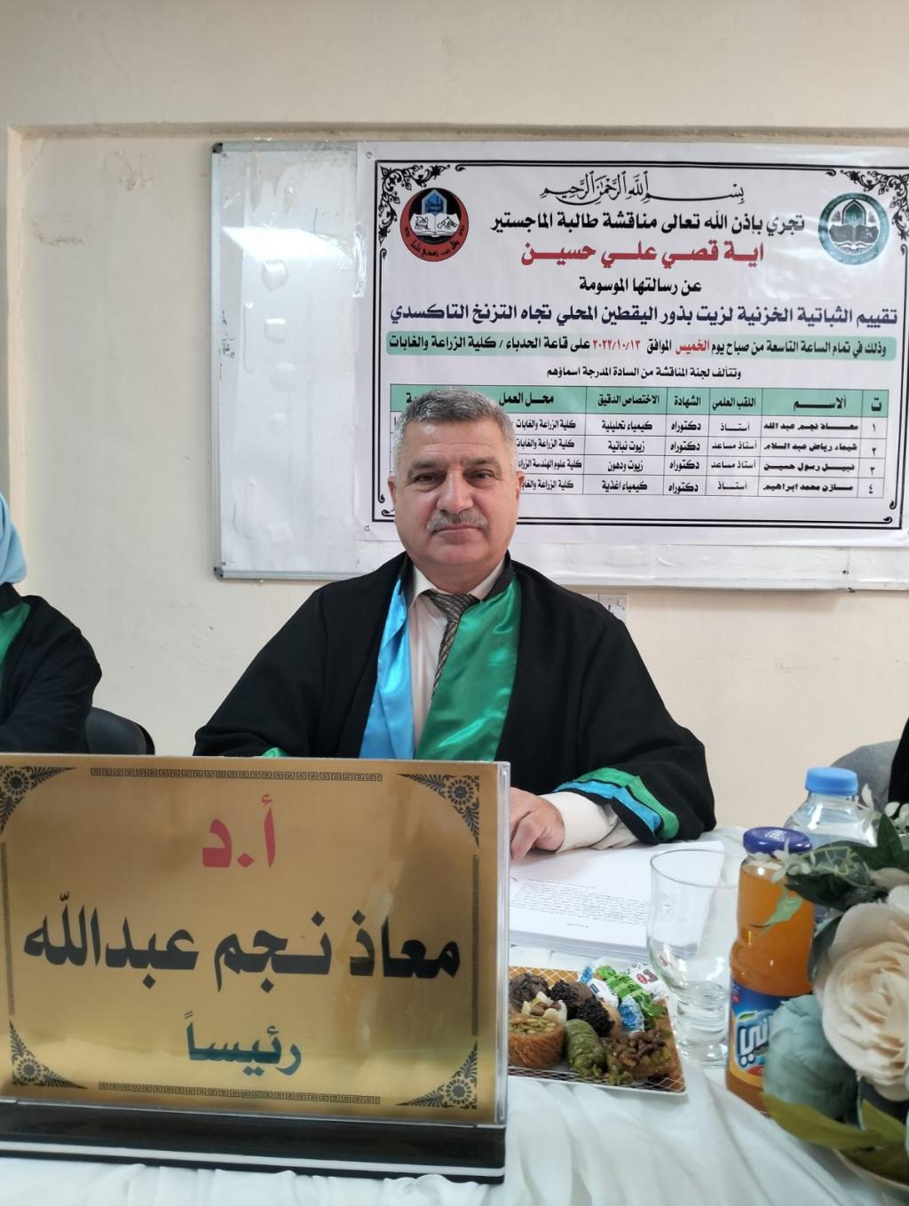 A master’s thesis was discussed in the Department of Food Sciences / College of Agriculture and Forestry / University of Mosul for the student (Aya Qusay Ali Hussein) on Thursday, 13-October -2022. Thesis title (Evaluation of the storage stability of local pumpkin seed oil against oxidative rancidity). Prof. Dr. Muhammad Younis Al-Allaf (Dean of the College) and his assistants for scientific and administrative affairs attended part of the discussion.The discussion committee consisted of: