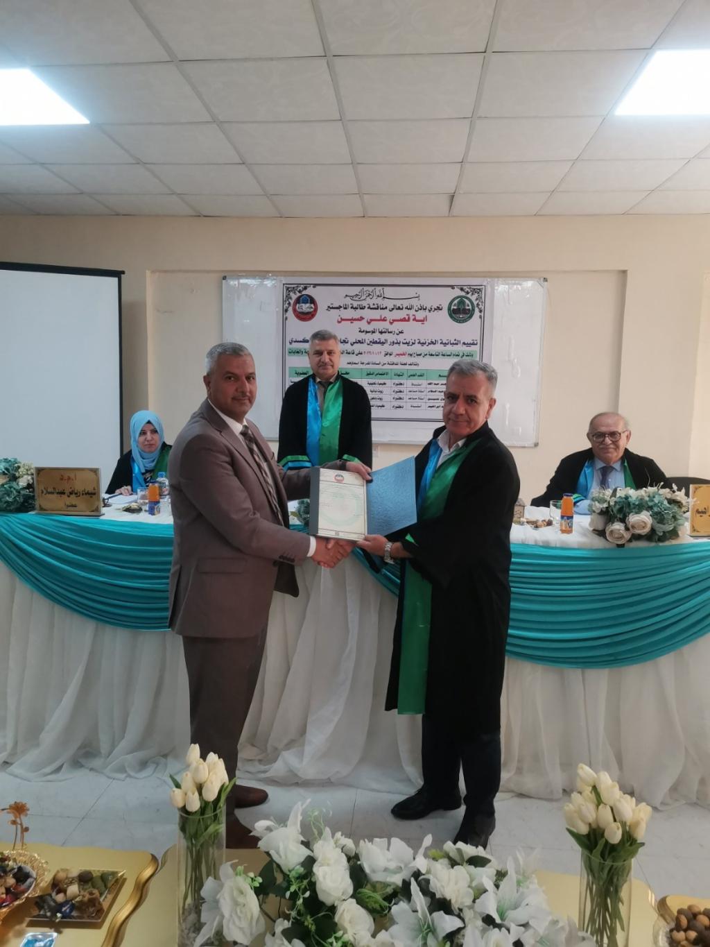 3. Dr. Nabil Rasoul Hussain (Member).4.Prof. Dr. Mazen Muhammad Ibrahim (Member and supervisor).Then the discussion committee read the decision, which included acceptance of the thesis and awarded the student an M.Sc. degree.Congratulations on Obtaining Your Master’s Degree