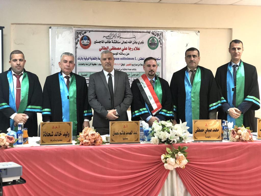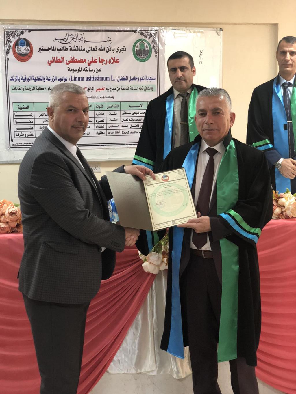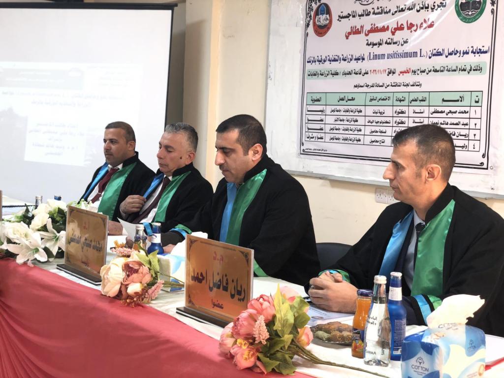 A master’s thesis was discussed in the Department of Field Crops / College of Agriculture and Forestry / University of Mosul for the student (Alaa Raja Ali) on Thursday, 17 November 2022. Thesis title (The response of the growth and yield of flax, Linum usitissimum L to planting dates, and foliar nutrition with zinc). Prof. Dr. Muhammad Younis Al-Allaf (Dean of the College) attended part of the discussion. The research aims to study the effect of planting dates (11/30, 12/20, 1/10) and zinc concentrations (0, 15, 30, 45, 60 mg/L) on the growth, yield, and quality of flax (Sharda).The discussion committee consisted of: