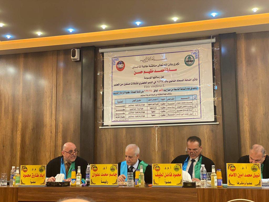 A master’s thesis was discussed in the Department of Horticulture and Landscape Architecture / College of Agriculture and Forestry / University of Mosul for the student (Sarah Ahmed Muqeem) on Sunday, 4-November -2022. Thesis title (The effect of adding nano fertilizer NBK on the vegetative growth of seedlings of two grape varieties). The study aimed to demonstrate the importance of nano-fertilization and the application method in improving the growth and mineral content of seedlings of two grape varieties.The discussion committee consisted of:
