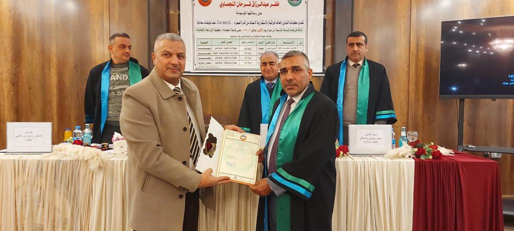 A master’s thesis was discussed in the Department of field crops / College of Agriculture and Forestry / University of Mosul for the student (Zafar Abdel-Razzaq Farhan) on Monday, 2-January -2023. Thesis title (Estimating the components of variation, genetic parameters, and stability of yellow corn varieties Zea mays L in fertilizer combinations). Prof. Dr. Muhammad Younis Al-Allaf (Dean of the College) and Prof. Dr. Ali Farouk Al-Maadidi (Assistant to the Dean for Scientific Affairs) attended a part of the discussion.The discussion committee consisted of: