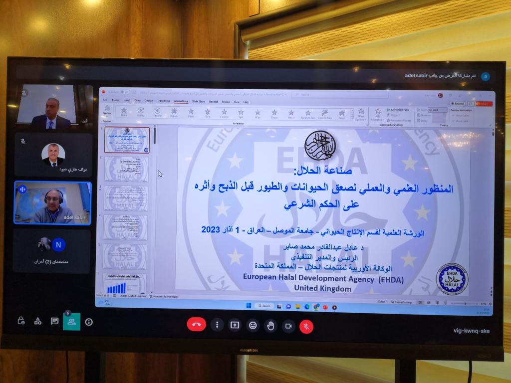 Today, Wednesday, March 1, under the auspices of Prof. Dr. Muhammad Younis Al-Allaf (Dean of the College) and the supervision of Prof. Dr. Omar Diaa Al-Mallah (Head of the Animal Production Department), the Department of Animal Production established in our college and cooperation with Prof. Dr. Adel Abdel Qader Muhammad Saber (President and Executive Director / European Agency for Products Halal-United Kingdom) Workshop entitled (Halal Industry: The Scientific and Practical Perspective of Stunning Animals and Birds Before Slaughter and Its Impact on Sharia Ruling).