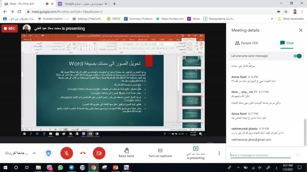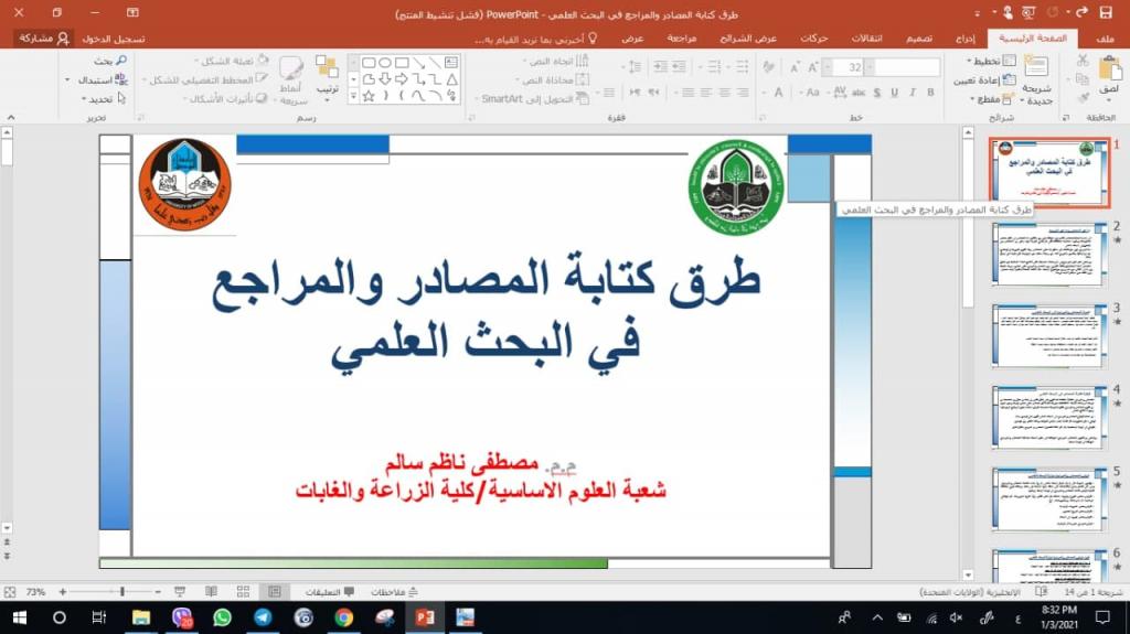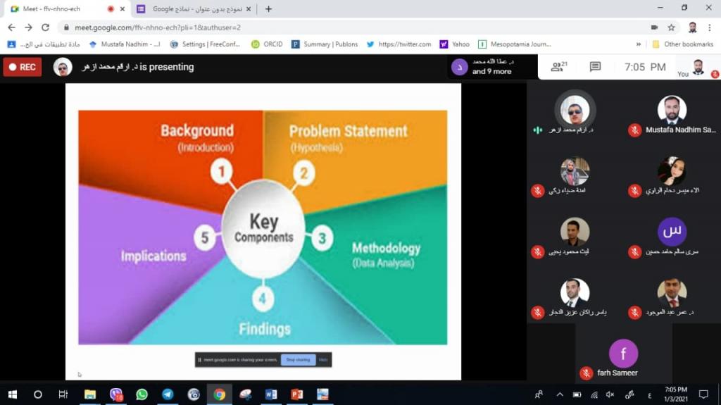 Under the Patronage of the Dean of the College, Asst. Prof. Dr. Mohammed Younis Al-Allaf and with the supervision of the Head of the Division of Basic Science, the Division of Basic Science held an electronic training course entitled ” The quality of scientific research in light of the Corona pandemic ” by using the interactive program MEET on Sunday, 3 Jan -2020.The training course included:1-The Head of the Division of Basic Science welcomed the participants and appreciated the efforts of the faculty dean and the lecturers.2- Dr. Arqam Muhammad Azhar Al-Omari presented a lecture entitled (How to write your abstract by the academic way).3- Mr. Mustafa Nazem Salem presented a lecture entitled (Methods of writing references in scientific research).4-Mr. Muhammad Moaz Al-Bakri presented a lecture entitled (Some methods and shortcuts for office programs used in printing and formatting research and scientific papers).*****The course will continue for three days. You are cordially invited to this training course. See you there! *******