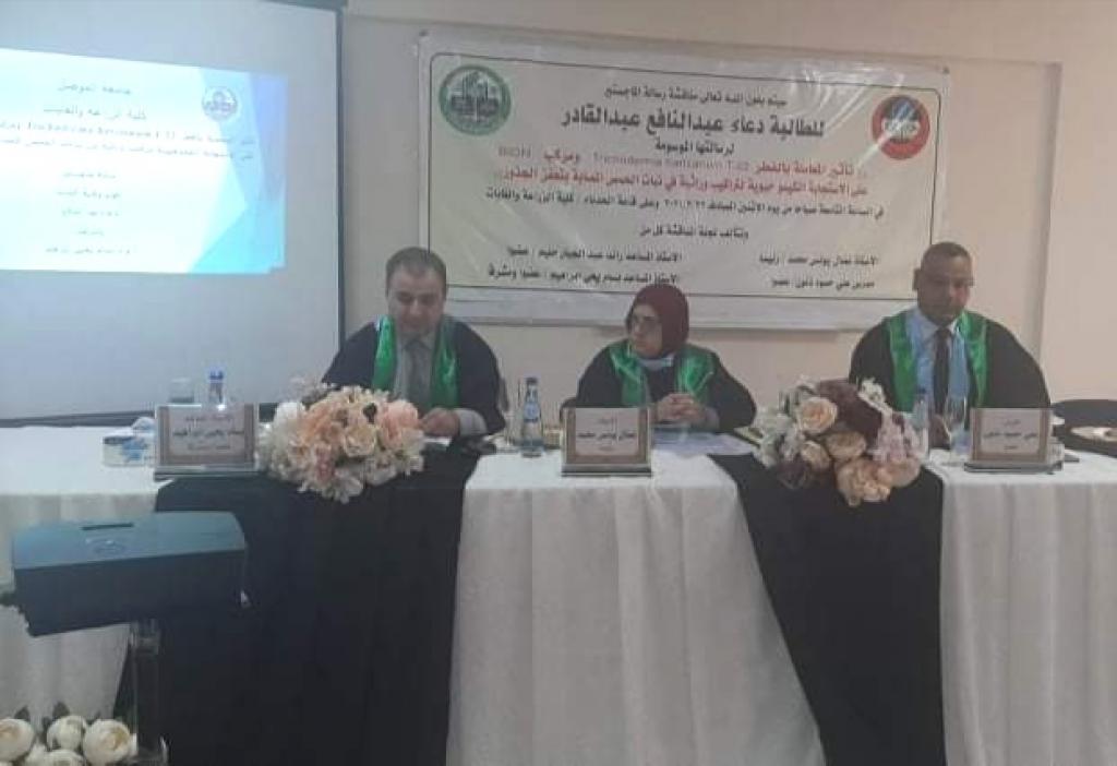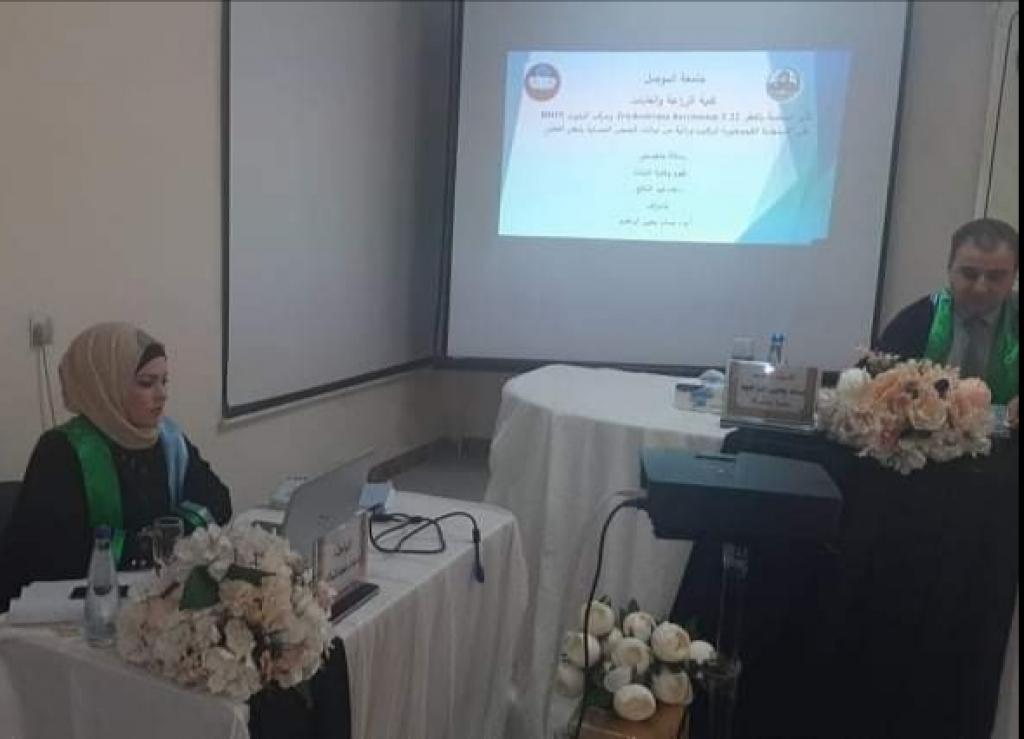 Dr. Muhammad Yunus Al-Allaf (Dean of the College of Agriculture and Forestry) attended a master’s thesis discussion in the Department of Plant Protection/ College of Agriculture and Forestry / University of Mosul, on (Effect of Trichoderma harzianum T-22 and Bion treatment on the biochemical response of some chickpea genotypes infected by root rot ) for the student (Doaa Abdel Nafeh Abdel Qader) on Monday 22/3/2021 in the Al-Hadba’a hall.The discussion committee consisted of: