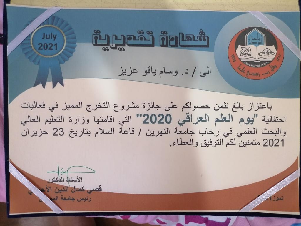 Prof. Dr. Qusay Kamal Al-Din Al-Ahmadi (President of the Mosul University) granted Dr. Wissam Yaqo Aziz (Lecturer in the Department of Agricultural Extension and Technology Transfer) a letter of thanks and appreciation for one of the graduation research he supervised receiving the award for the best graduation research within the Science Day.The management of the website congratulates Dr. Wissam for this honor and wishes him continued success