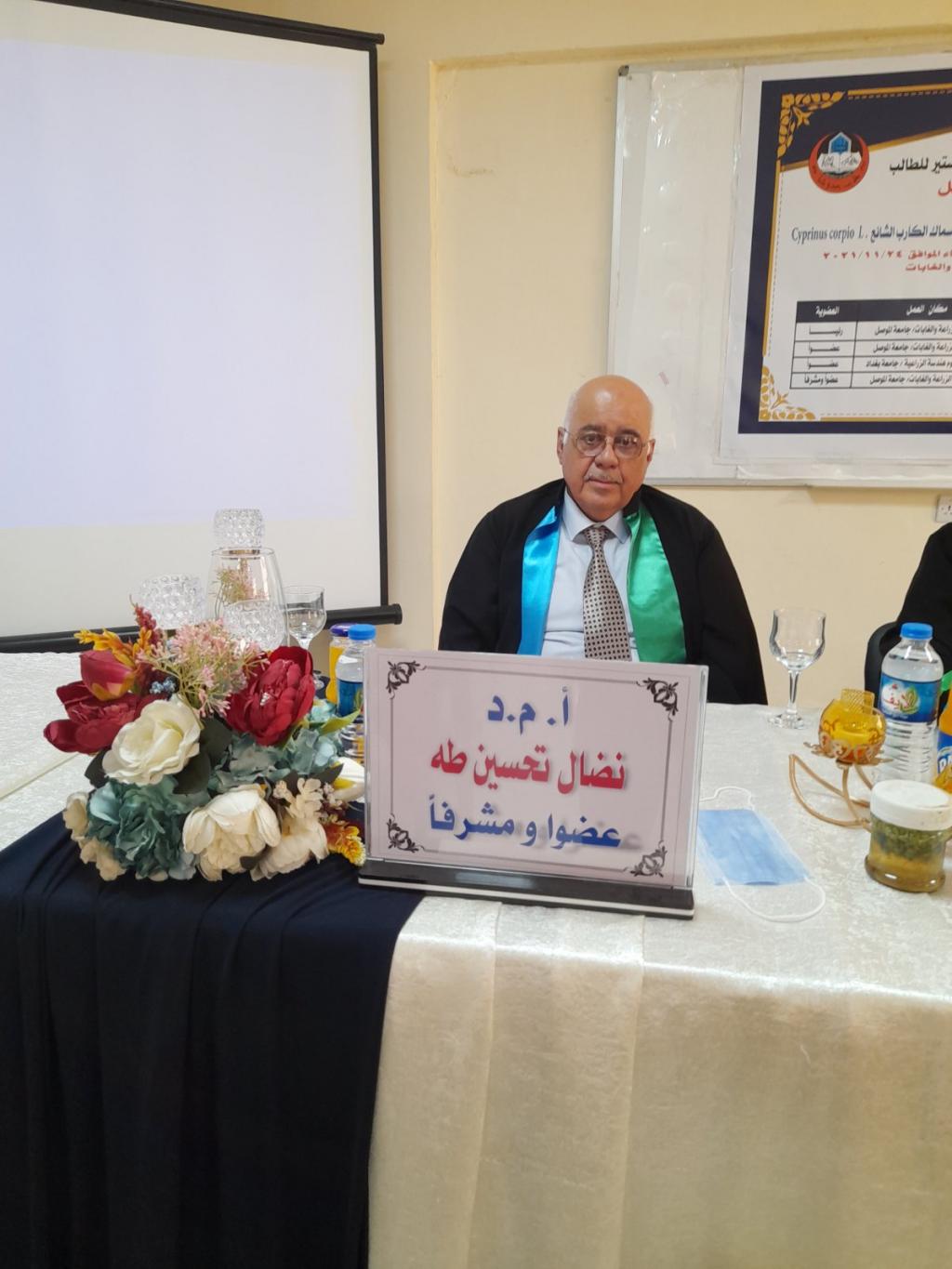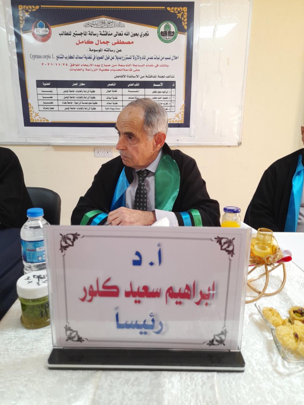 A master’s thesis was discussed in the Department of Animal Production/ College of Agriculture and Forestry / the University of Mosul on “Substitution of proportions the Azolla and Duckweed plant instead of Soybeans in the feeding of Common Carb Fish (Cyprinus Carpio L.)” for the student (Mustafa Jamal Kamel) on Wednesday 24/11/2021. Prof. Dr. Muhammad Yunus Al-Allaf (Dean of the College) attended a part of the discussion.The discussion committee consisted of: