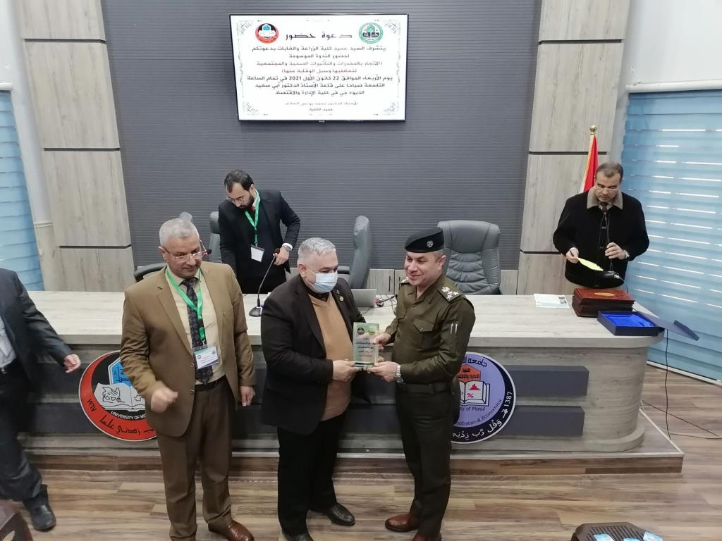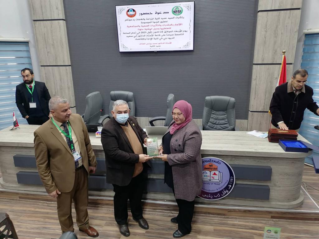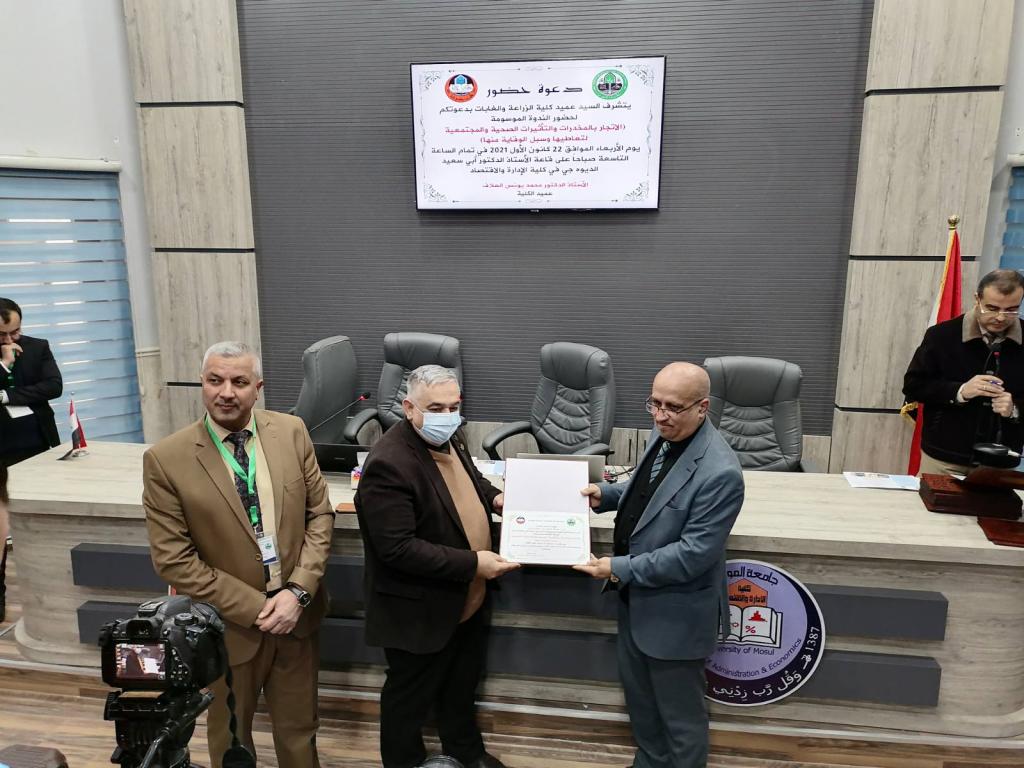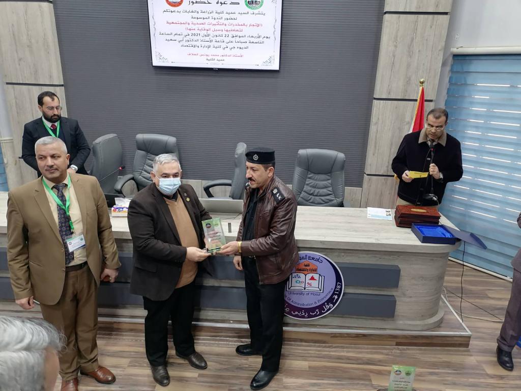 Under the patronage of Prof. Dr. Qusay Kamal Al-Din Al-Ahmadi (President of the University of Mosul) and the supervision of Prof. Dr. Muhammad Younis Al-Allaf (Dean of the Faculty of Agriculture and Forestry), the Deanship held a scientific symposium on (drug trafficking, the health and societal effects of its use and ways to prevent it). The scientific symposium was attended by Prof. Dr. Munir Salem Taha (Assistant to the President of the University for Scientific Affairs), representatives from the anti-drug departments, the community police, and the Nineveh health department, as well as lecturers from the University of Mosul.During the scientific symposium, participants discussed the negative effects of drug abuse, especially among young people, and how to protect society from it. Prof. Dr. Munir Salem Taha distributed the certificates of appreciation to the participants in the symposium.