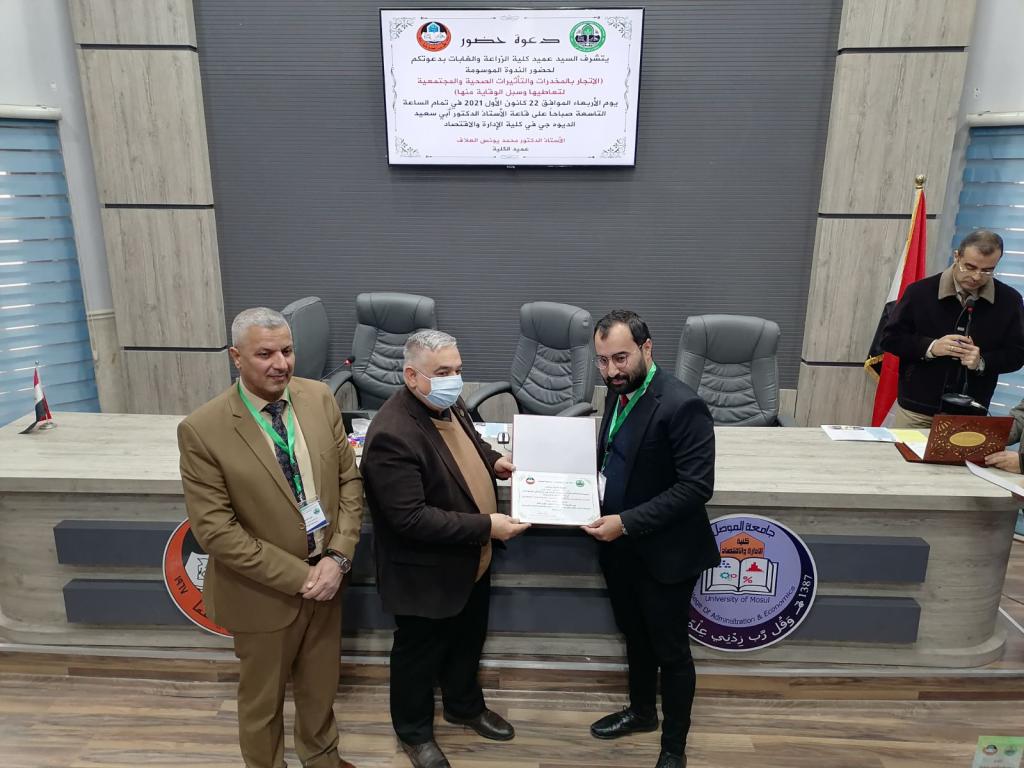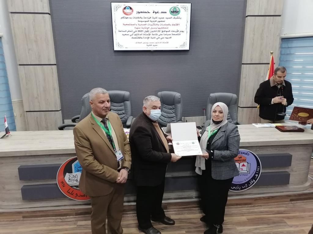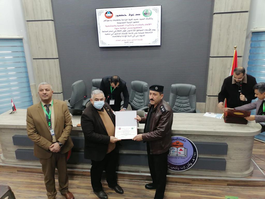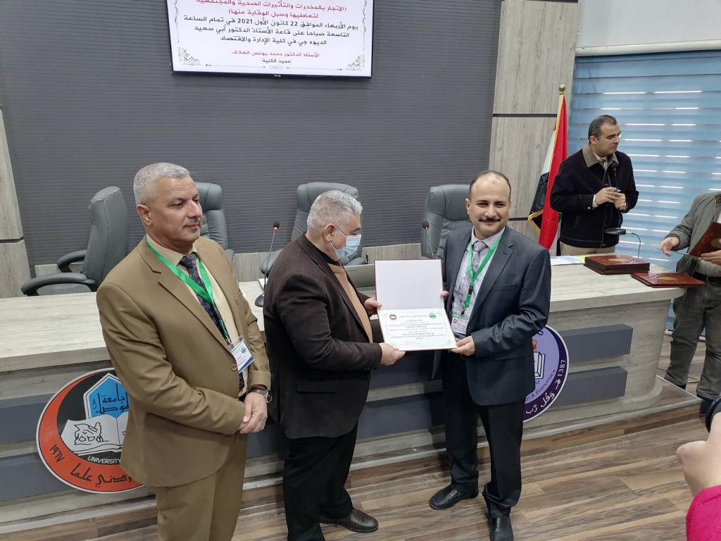 Under the patronage of Prof. Dr. Qusay Kamal Al-Din Al-Ahmadi (President of the University of Mosul) and the supervision of Prof. Dr. Muhammad Younis Al-Allaf (Dean of the Faculty of Agriculture and Forestry), the Deanship held a scientific symposium on (drug trafficking, the health and societal effects of its use and ways to prevent it). The scientific symposium was attended by Prof. Dr. Munir Salem Taha (Assistant to the President of the University for Scientific Affairs), representatives from the anti-drug departments, the community police, and the Nineveh health department, as well as lecturers from the University of Mosul.During the scientific symposium, participants discussed the negative effects of drug abuse, especially among young people, and how to protect society from it. Prof. Dr. Munir Salem Taha distributed the certificates of appreciation to the participants in the symposium.