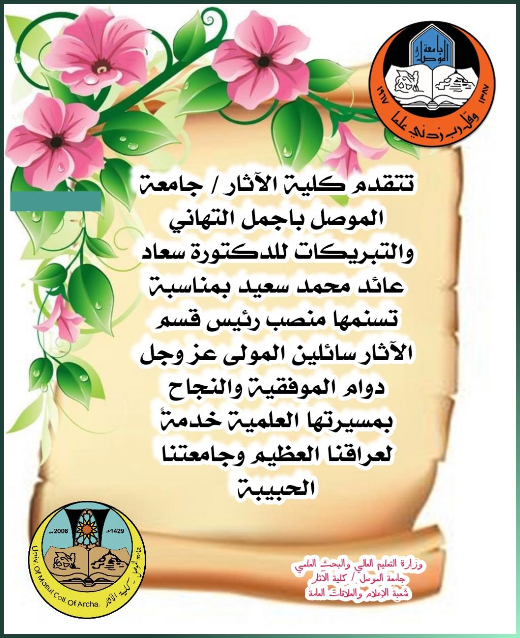 University of Mosul/ College of Archaeology would like to present congratulations to Dr. Suad Aaid Mohammed on the occasion of appointing her as the Head of Department of Archaeology. We hope all the best for her and more flourish and success in her carrier to serve for our great country and our beloved university.