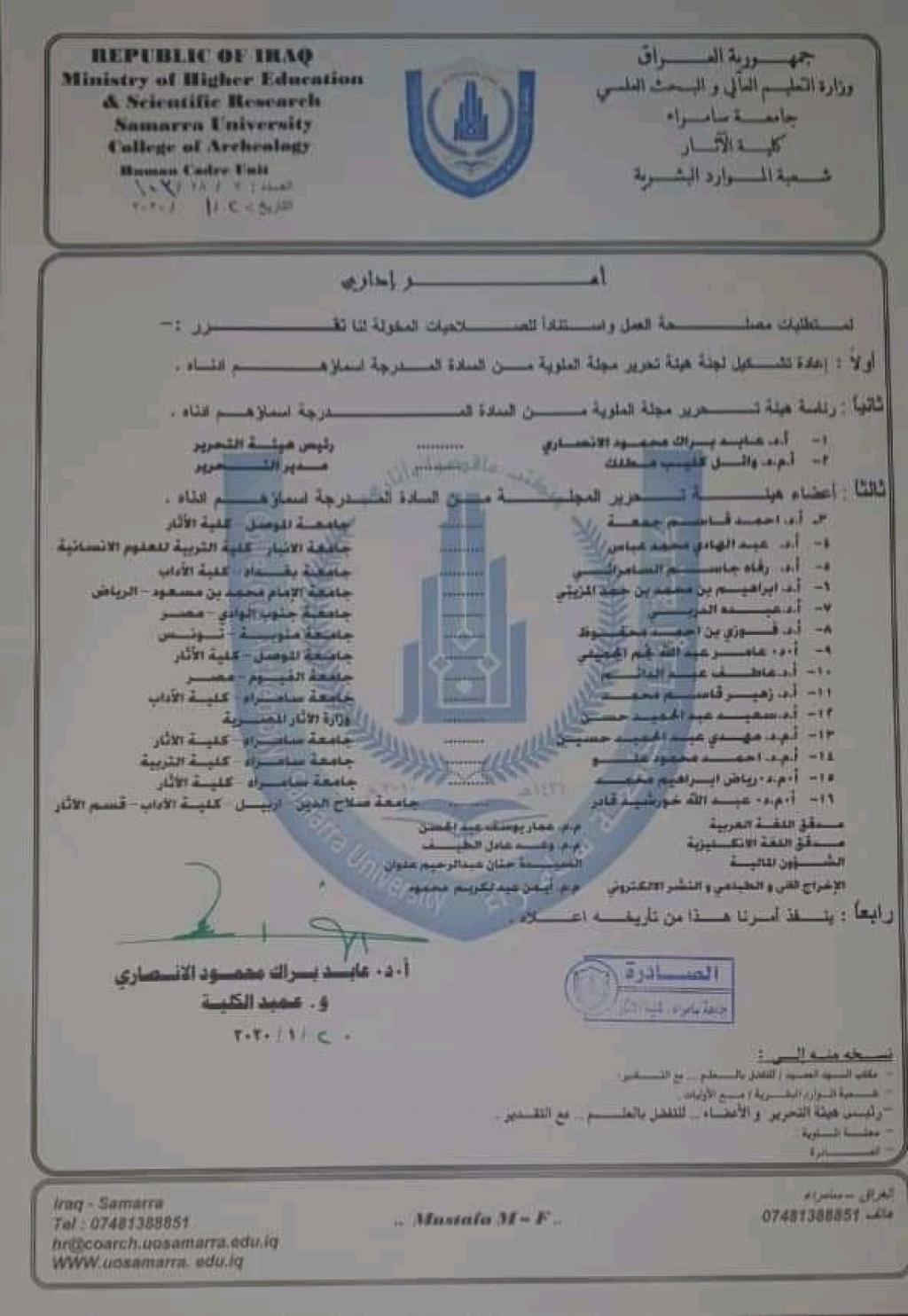 Prof. Dr Amer Abullah Najim Aljumailee/ Department of Archaeology/ College of Archaeology/ University of Mosul was chosen as a member of the Editorial Board of Al-Mallawiyah Magazine, A periodical Journal issued from College of Archaeology/ University of Samraa .