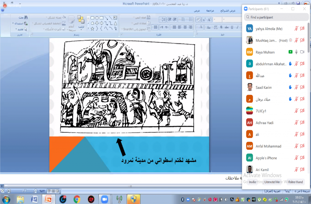 Under the patronage of the president of university of Mosul Prof. Dr. Qusai Alahmadee and the supervison of the dean of the college Asst. Prof. Dr. Yasameen Abdulkareem and under. On Sunday May 10th 2020, College of Archaeology held a workshop entitled “Medicine in Mesopotamia between originality and effect”. The workshop was delivered by the following:Prof Dr Nawala Ahmed Manhmood delivered a lecturer entitled (epilepsy in light of Sumerian sources of Mesopotamia2: Dr. Raya Muhsen delivered a lecture entitled (the importance of cylinder stamps in curing pandemics and diseases in ancient Iraq.