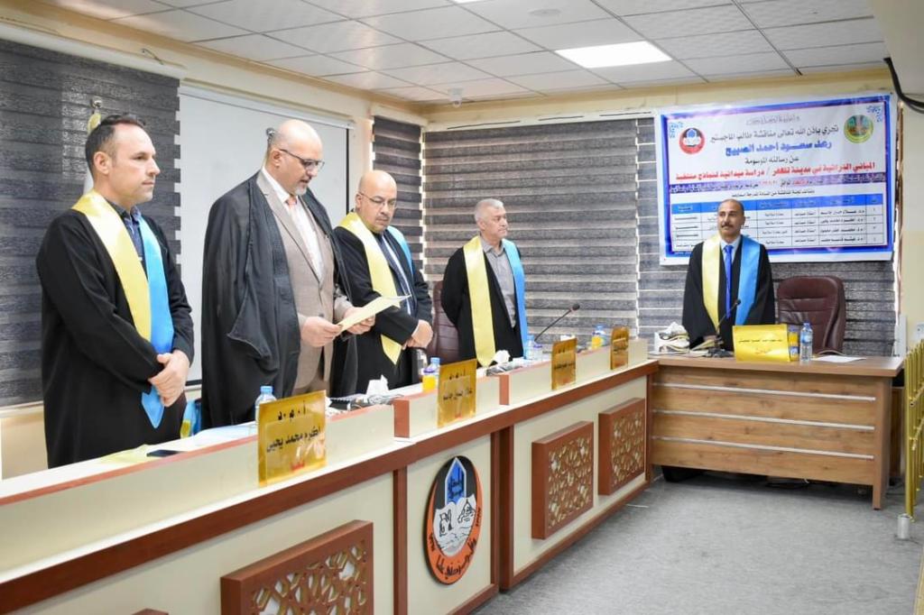 The college of Archeology discussed the master’s thesis of researcher Raad Saud Ahmed Al-Sabih Al-Juhaishi entitled(Heritage buildings in the city of Tal Afar, a field study of selected samples) on Wednesday morning, 9/21/2022 in Abi Tammam Hall The thesis dealt with the buildings of Tal Afar, which is considered the first field documentary study of the buildings of Tal Afar and took selected samples and included mosques, residential houses, Khan service buildings and barrages. A chapter was devoted to the study of the general features and characteristics of buildings and their architectural elements. The aim of this study is to document heritage buildings that have not been studied previously, and all these buildings are subject to demise and dilapidated to fall due to neglect and lack of maintenance. The viva committee consisted of: Assistant Professor Dr. Alaa Hussein Jassim as Chairman Assistant Professor Dr. Akram Muhammad Yahya as Member Assistant Professor Dr. Muhammad Khader Mahmoud as Member Assistant Professor Dr. Haitham Qassem Mohammed, member and supervisor