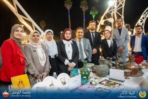 The College of Archaeology Participates in the Central Celebration of the 58th Anniversary of the Founding of the University of Mosul. The celebration took place on the evening of Sunday, April 13, 2025, at 6:00 PM, at our beloved university. The event featured the participation of the college’s deanship, in the presence of the dean, Professor Yasmin Abdul Karim Muhammad Ali. The event was also attended by the dean’s assistants for academic and administrative affairs, members of the committees participating in the celebration, and a select group of college staff and students. The college’s contributions to the celebration included cuneiform seals, artifacts, and a number of heritage vessels, as well as traditional dishes famous in the city of Mosul. May our university be well every year, a great academic institution that has graduated generations of talented individuals.