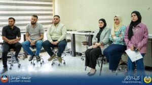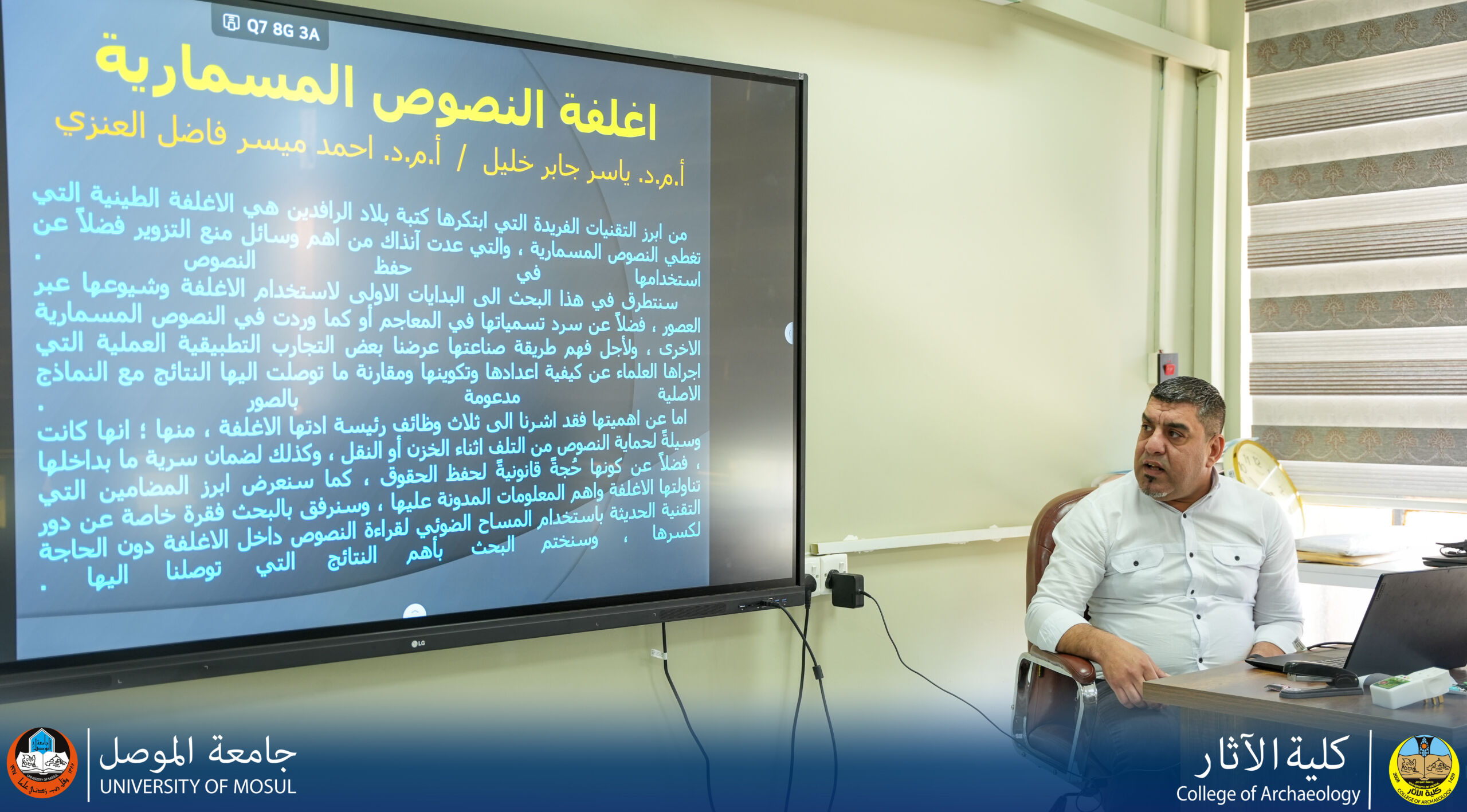 (Cuneiform Text Covers) In a seminar, the Department of Civilization in the College of Archaeology held a seminar entitled: (Cuneiform Text Covers) on Monday, April 28, 2025, in the Computer Lab Hall. The seminar was a joint research study between Assistant Professor Dr. Yasser Jaber Khalil and Assistant Professor Dr. Ahmed Maysar Fadel. The research paper was delivered by Assistant Professor Dr. Ahmed Maysar Fadel. The study addressed the most prominent unique techniques invented by Mesopotamian scribes: clay covers that cover cuneiform texts. These covers were considered at the time one of the most important means of preventing forgery, in addition to their use in preserving texts. The research addressed the early beginnings of the use of covers and their prevalence throughout the ages, as well as listing their names in dictionaries and cuneiform texts. Some practical experiments conducted by scientists on how to prepare and manufacture covers were also presented, supported by images. The research also highlighted the most important functions performed by covers, explaining their contents and the information recorded on them. The research concluded with the most important findings.