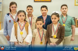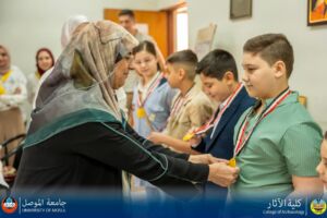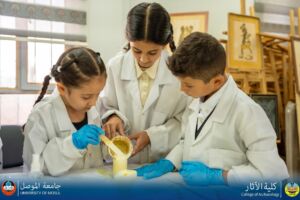 Under the supervision and follow-up of the Dean of the College, Professor Dr. Yasmine Abdul Karim Muhammad Ali, the Student Activities Division at the College held a course titled “Casting Turkish Stone in Ancient Molds” for the children of university and college students at the University of Mosul, for the age group (9-12 years). The course was held for three days, starting on September 8, 2025, in the Creativity and Excellence Hall at the College. The course included a detailed explanation of how to cast stone in molds on the first day, along with a practical application. The second day included a detailed explanation of how to cast wax. At the end of the course, the participants were honored. The workshop was moderated by visual arts researcher Faten Anwar Shihab and Asst. Lect. Nour Faisal.