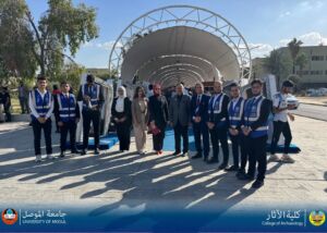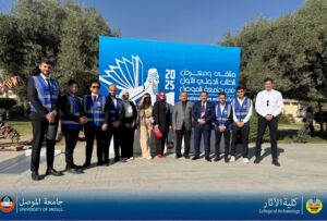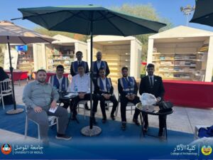 The College of Archaeology at the University of Mosul participated in the activities of the First International Book Fair and Forum held at the university, with broad participation from various colleges and students. The Dean of the College, Professor Dr. Yasmin Abdul Karim Muhammad Ali, and the Assistant Dean for Administrative and Financial Affairs, Dr. Iyad Younis Dhanoun, attended, along with the Head of the Department of Ancient Iraqi Languages, Assistant Professor Dr. Muath Habash Khader, and the Head of the Student Activities Unit, Assistant Lecturer Arshad Ali Muhammad Ali.
