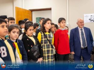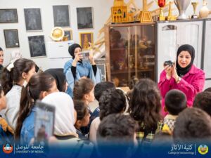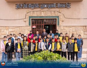 The College of Archaeology welcomed a scientific visit from students of Al-Jeel Al-Mumayaz Mixed Primary School, along with several members of the school staff, on Wednesday, November 26, 2025. They were received by Dr. Yasser Jaber, Assistant Dean for Scientific Affairs, and a number of faculty members. The visit aimed to foster intellectual and cultural exchange between educational institutions within the Ministries of Education and Higher Education, with the goal of introducing students to the importance and value of antiquities, methods of preservation, and the history of cuneiform writing.