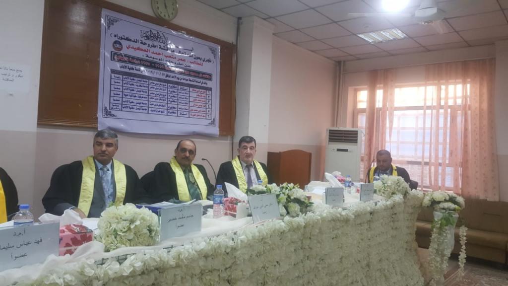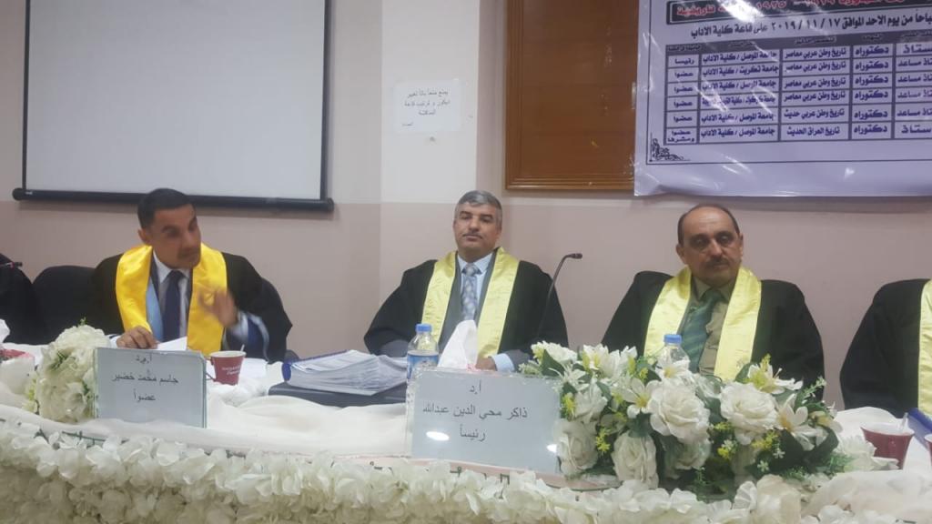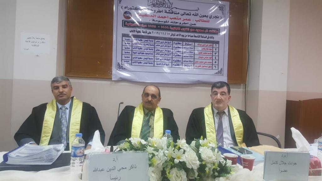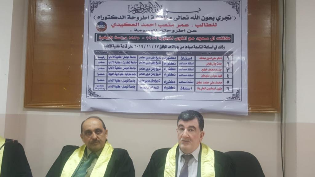 The doctoral thesis of the student Omar Miteb Ahmed Al-Akidi, entitled (Al-Saud relations with neighboring forces 1919-1925 historical study) under the supervision of Prof.Dr. Manhal Ismail Al-Ali Bey, and the discussion committee consisted of prof. Zakir Mohiuddin Abdullah, and Prof. Jawdat Jalal Kamel, and Prof. Jassim Mohammed Khudair, Prof. Fahad Abbas Suleiman, Ph.D. The thesis dealt with an important period in the history of the Saudi state and the events that accompanied this country in that country, especially relations, agreements and alliances between it and neighboring countries.