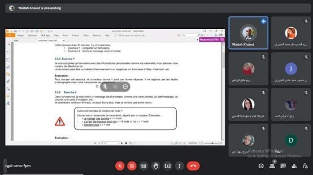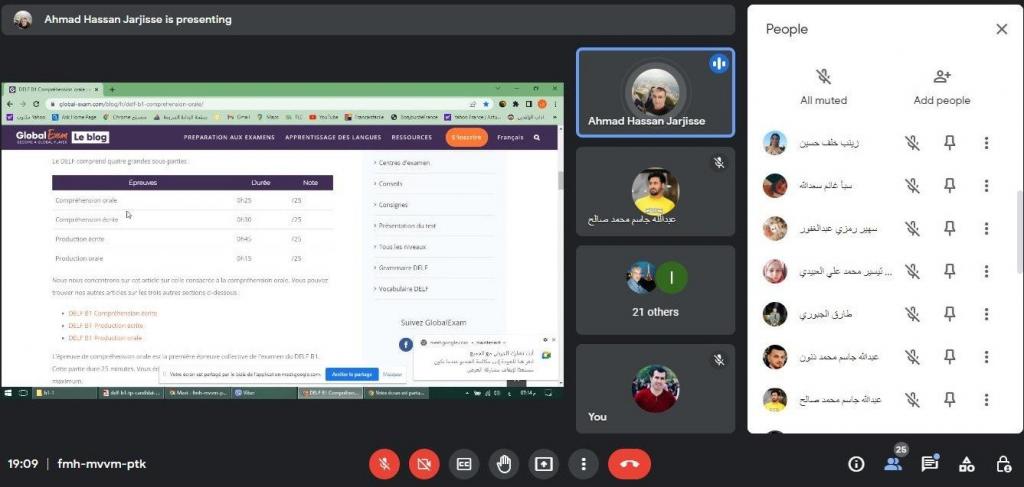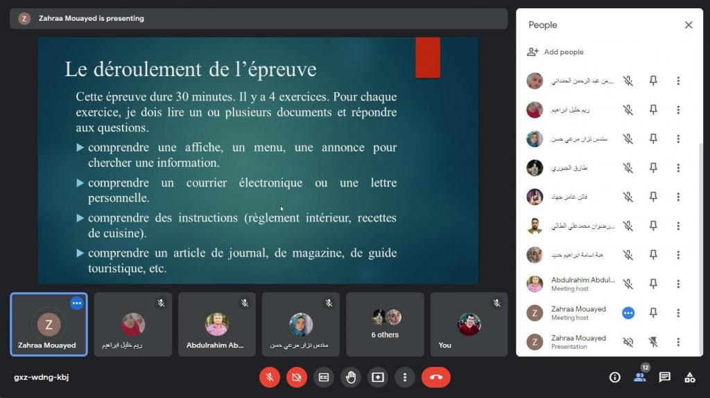Under the supervision of the Dean of the Faculty of Arts, Dr. Muhammad Ali Muhammad Afeen, French Department, and in cooperation with the Continuing Education Unit, held three (electronic training courses) for students of the French Language Department on the DELF exam mechanism for levels (A1, A2, B1). ) for four days and three hours per day for each session on the Google Meet application for the period (24-29 June 2022).The course aimed to familiarize the participants with the mechanism and instructions of the DELF exam and to train on how to answer the tests of oral comprehension, written comprehension, written expression and oral expression for each of the three levels. Students from the French Department participated in the course, in addition to a number of graduates.