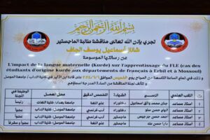 The study, presented by the student (Shanaz Ismail Youssef Al-Jaf), addresses the definition of the basic concepts and aspects of language and touches on the phenomenon of linguistic duality and multilingualism, as well as linguistic overlap and its types. The thesis aims to shed light on some of the influences that stem from the mother tongue on learning French as a foreign language.